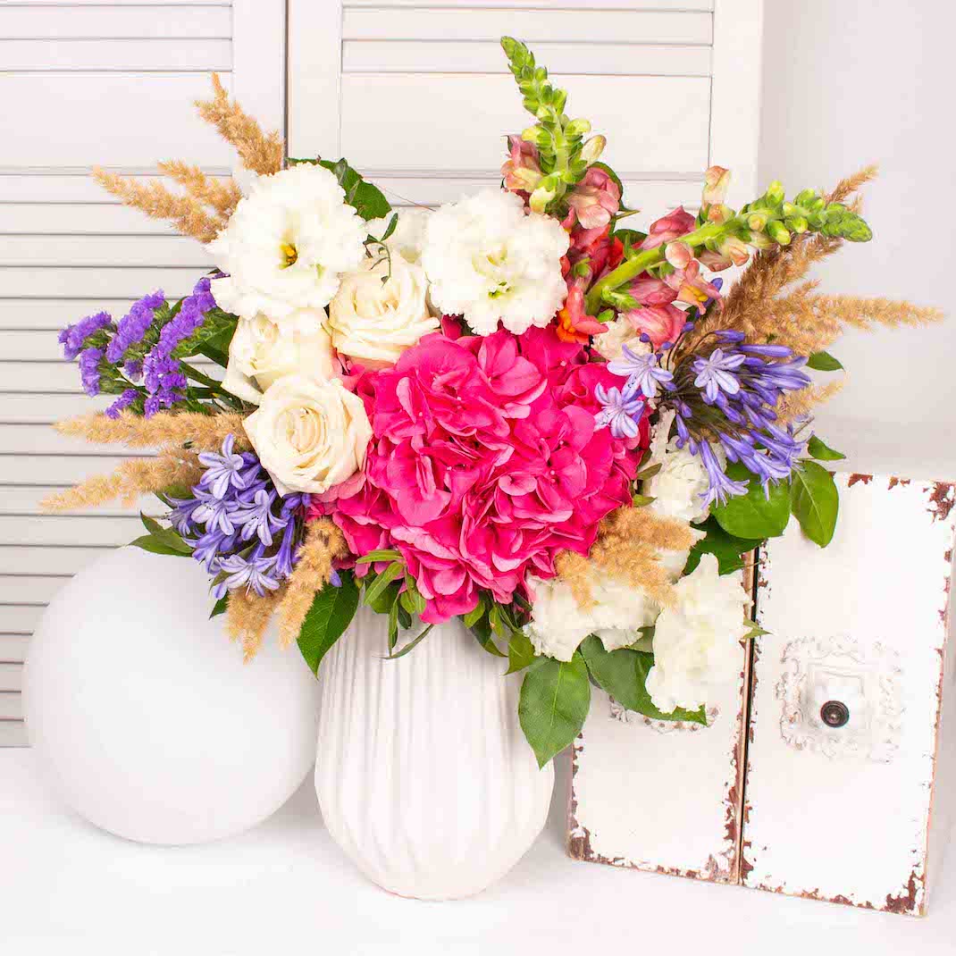 Buchet cu hortensie, 3 trandafiri albi, 2 anthirinum, verdeata si alte flori