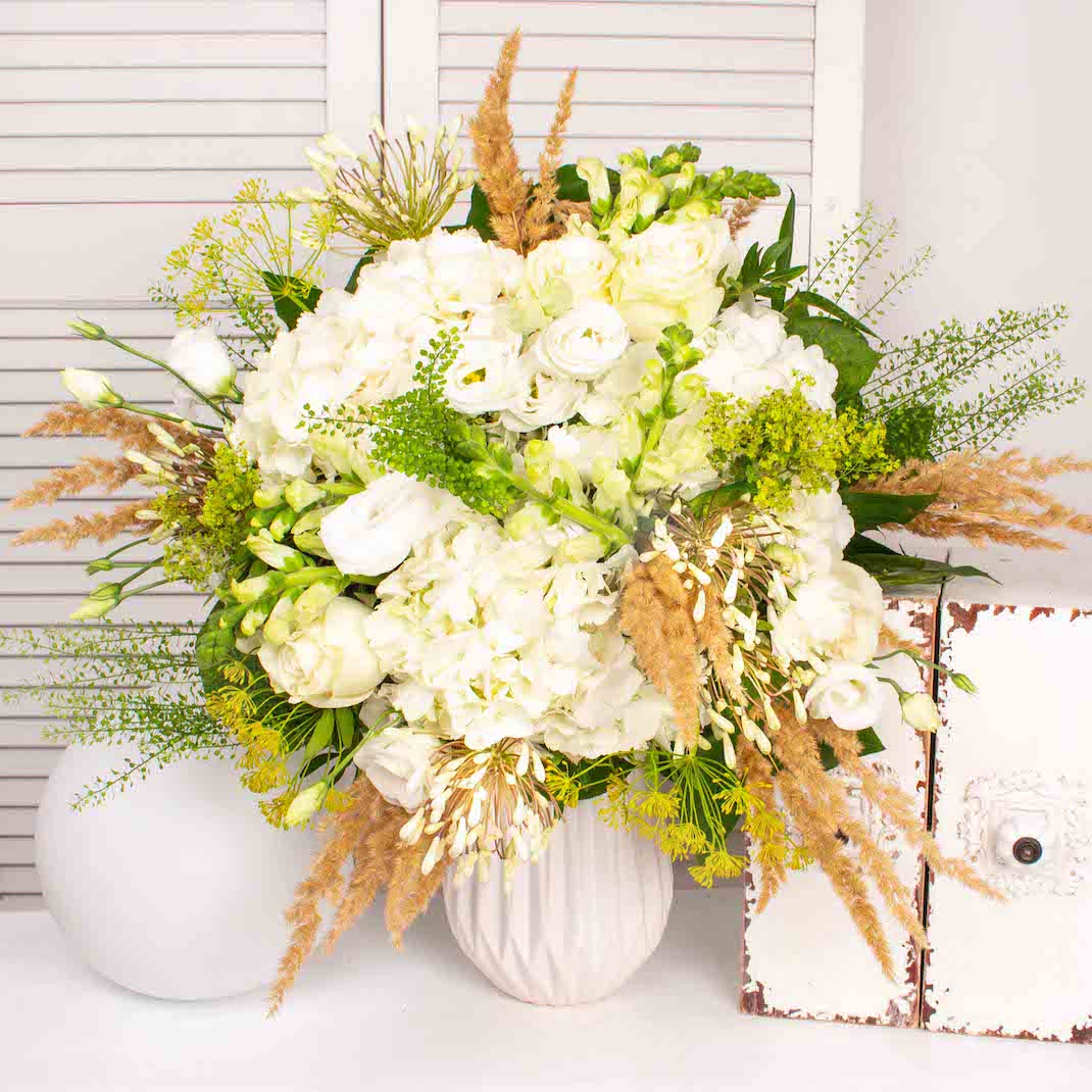 Buchet cu 3 hortensie albe, 5 trandafiri albi, 5 lisianthus alb, 6 anthirinum alb, verdeata si alte flori