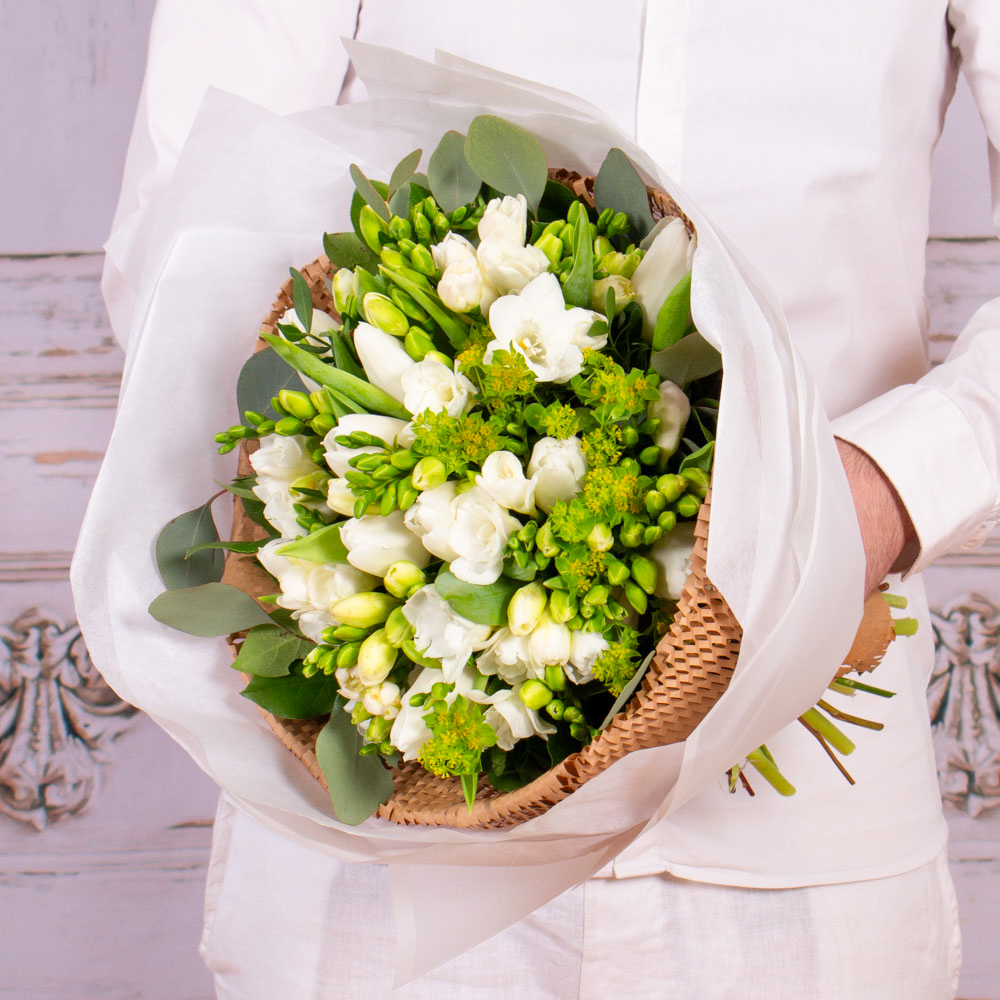 Buchet cu 19 fressia, 5 lalele albe, 3 bupleurum, verdeata si alte flori de decor.