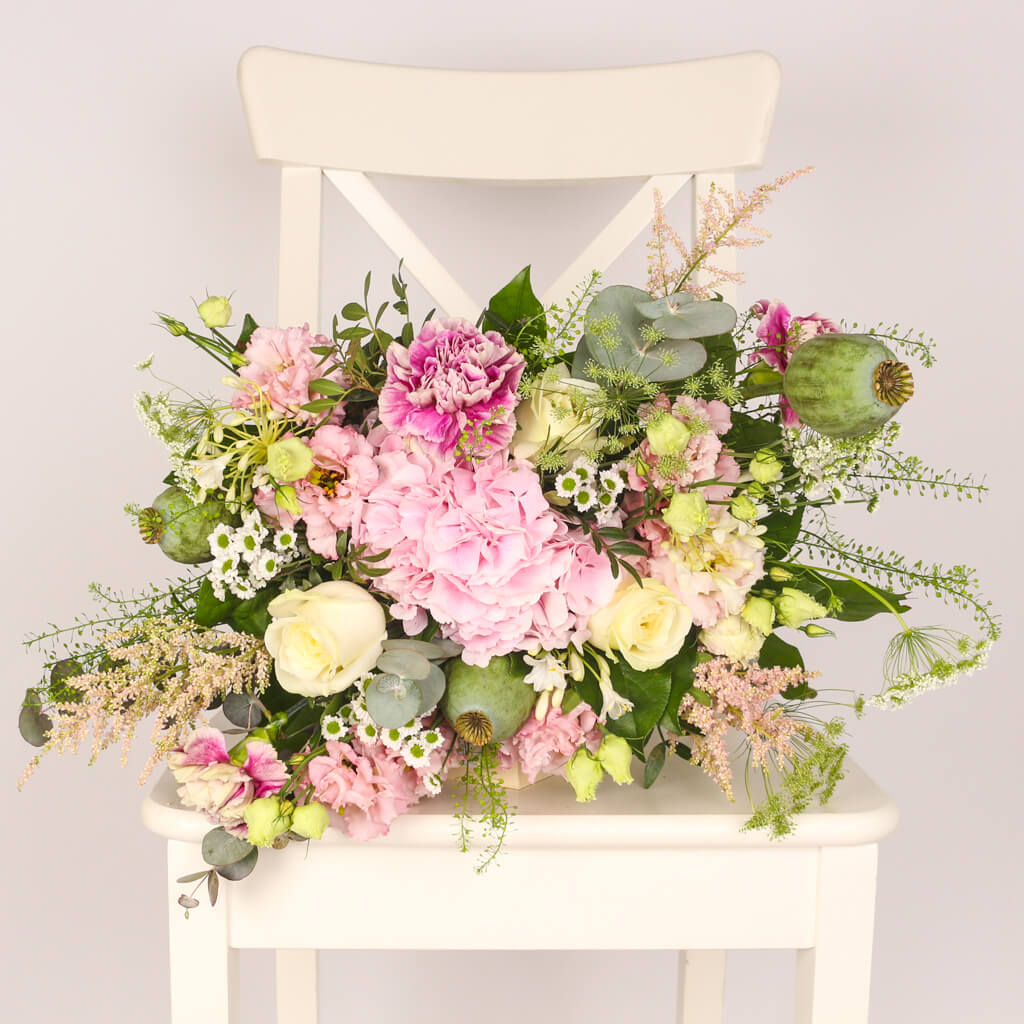 Buchet cu hortensie roz, 3 garoafe, 3 crizanteme, verdeata si alte flori