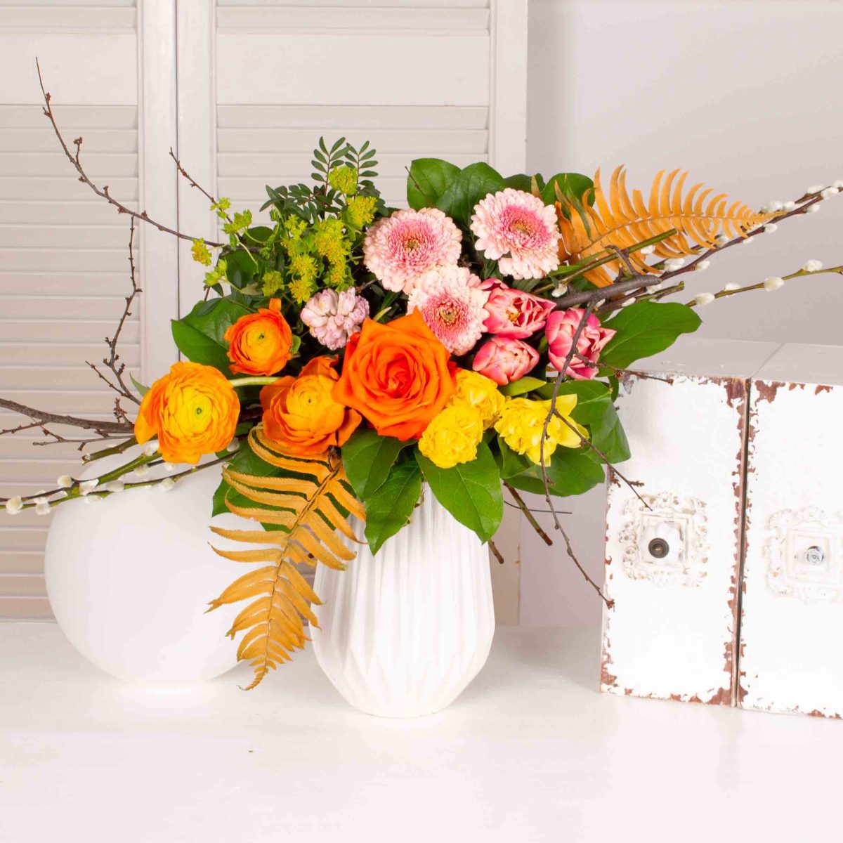 Buchet vesel cu ranunculus si trandafiri