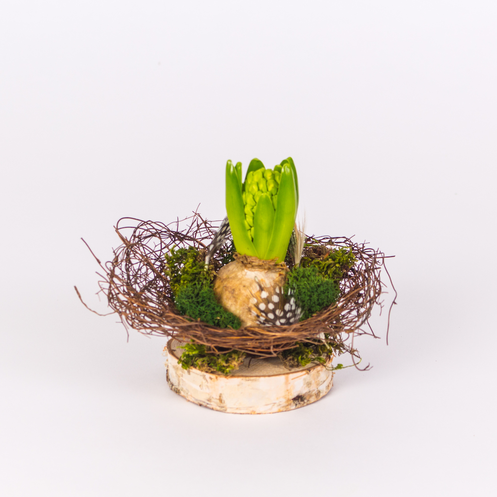 Aranjament pe felie de lemn cu 1 bulb de zambila, cuib mic, muschi verde, pene.