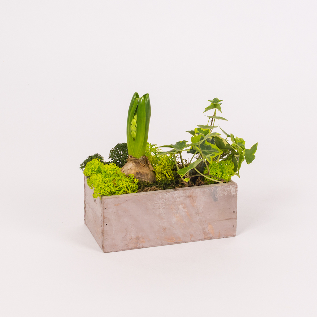 Cutie de lemn, bulb de zambila, iedera si muschi verde.