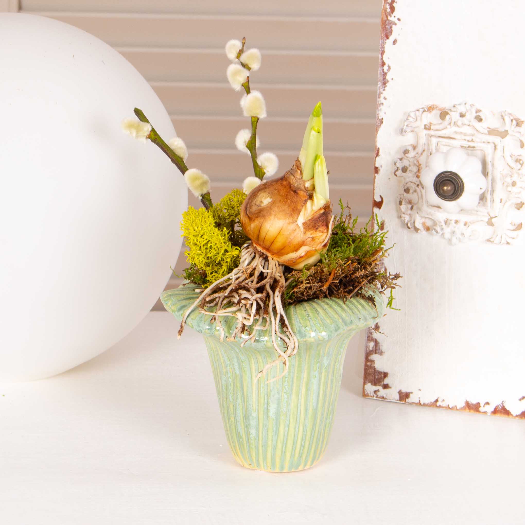Aranjament in vas ceramic cu bulb de narcisa, muschi verde, salix wilow.