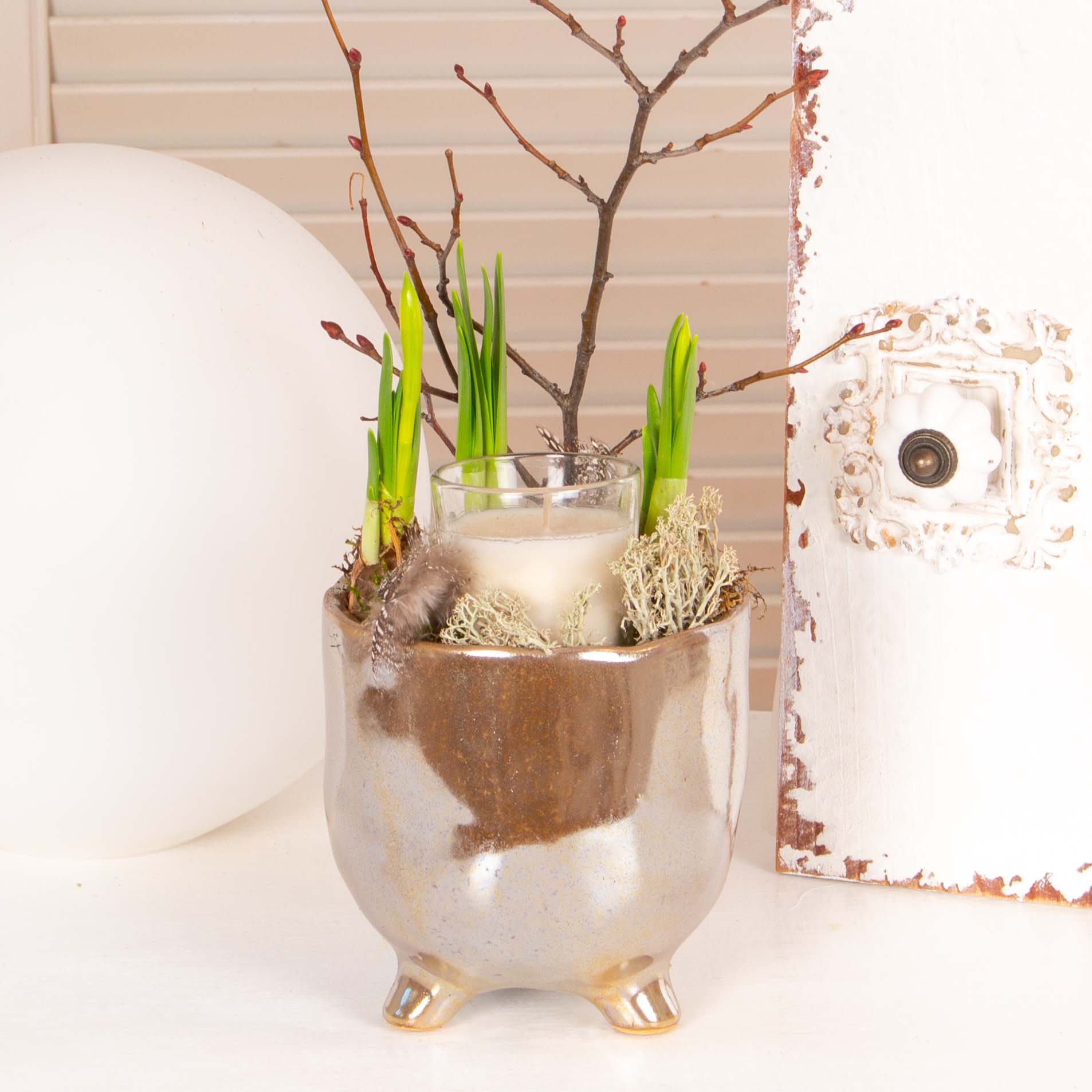 Aranjament in vas ceramic cu 3 bulbi de narcisa, lumanare, muschi verde, pene.