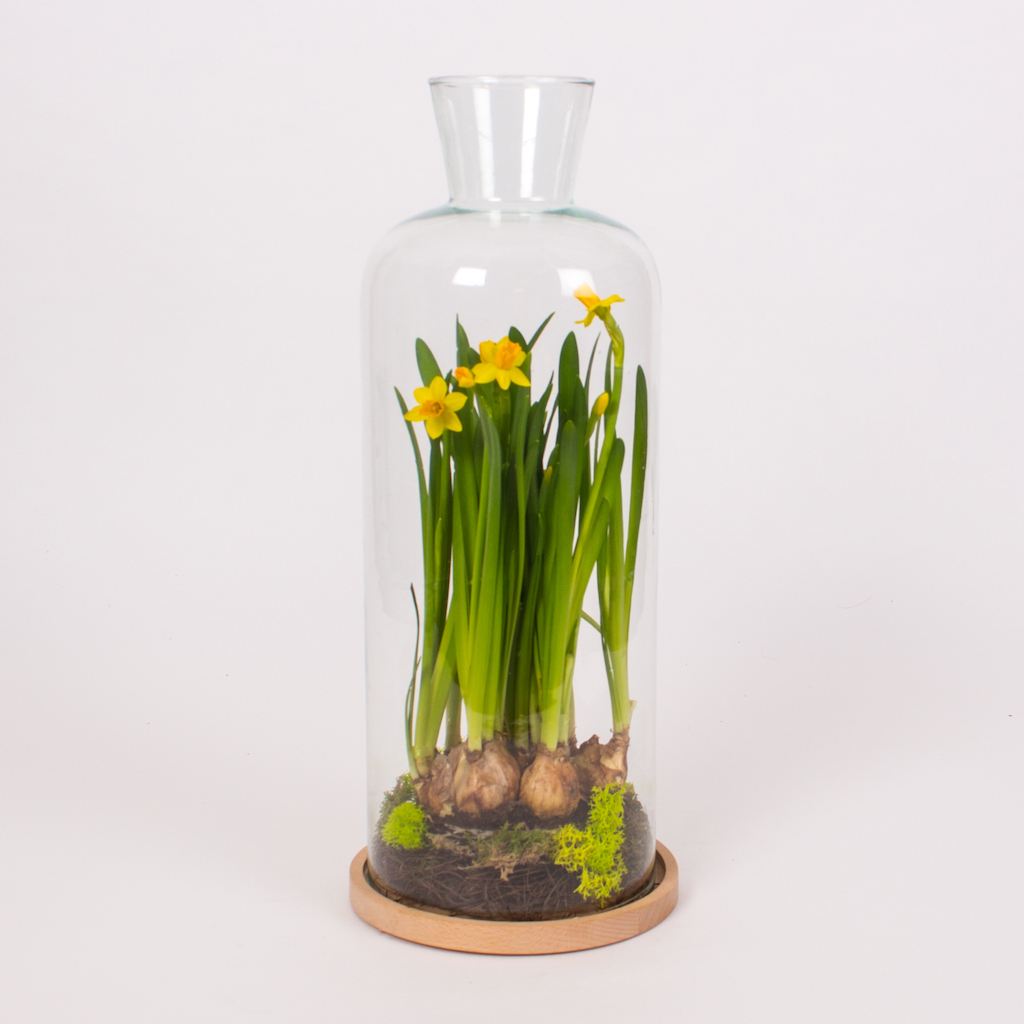 Aranjament in vas de sticla h44 cu 6 bulbi de narcisa si muschi verde.