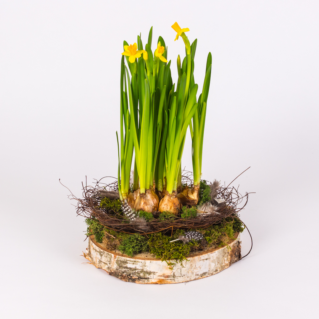 Aranjament pe felie de lemn cu 5 bulbi de narcisa, cuib mare, muschi verde si pene.