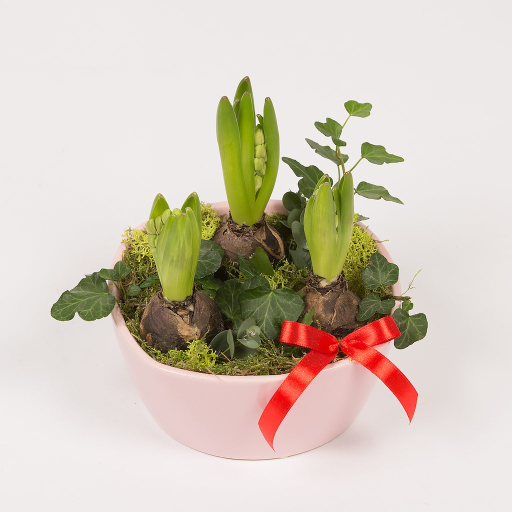Aranajament in vas ceramic cu 3 bulbi de zambila, muschi verde, iedera si eucalipt.