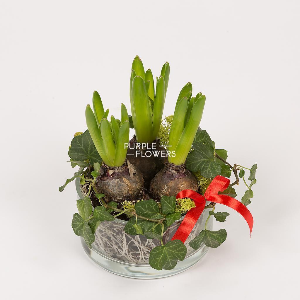 Vas de sticla, 3 bulbi de zambila si alte plante de decor.
