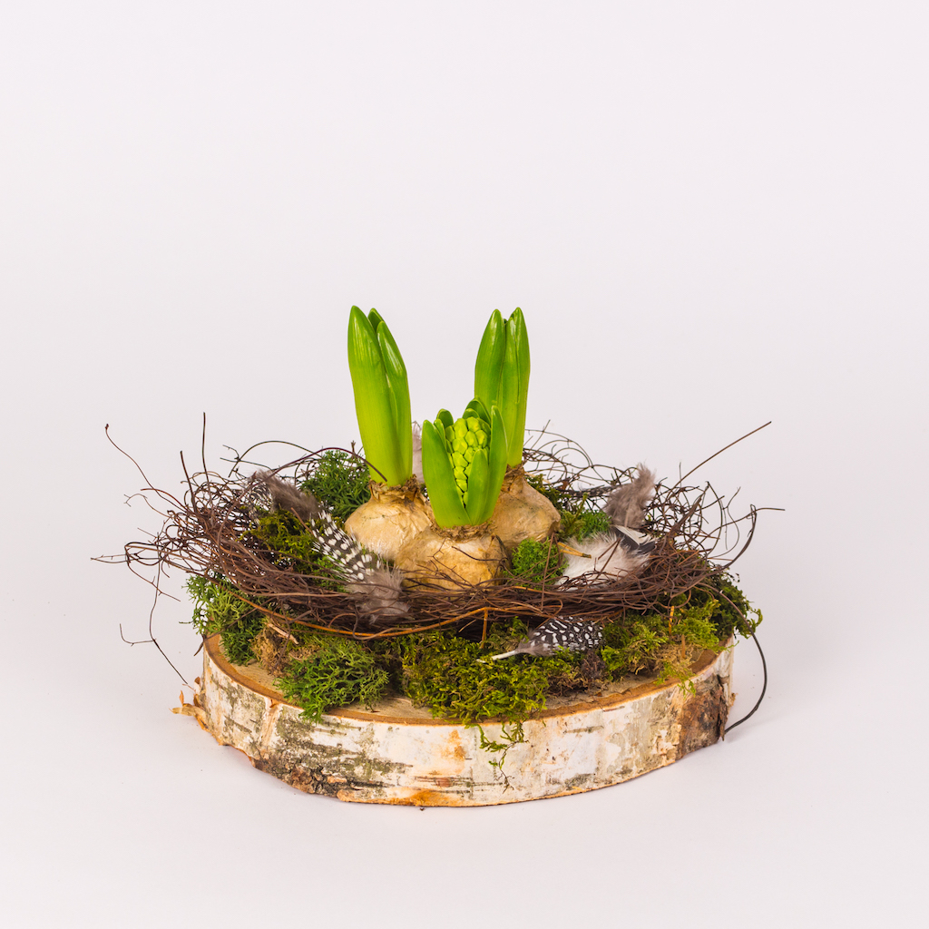 Aranjament pe felie de lemn cu 3 bulbi de zambila, cuib mare, muschi verde si pene.