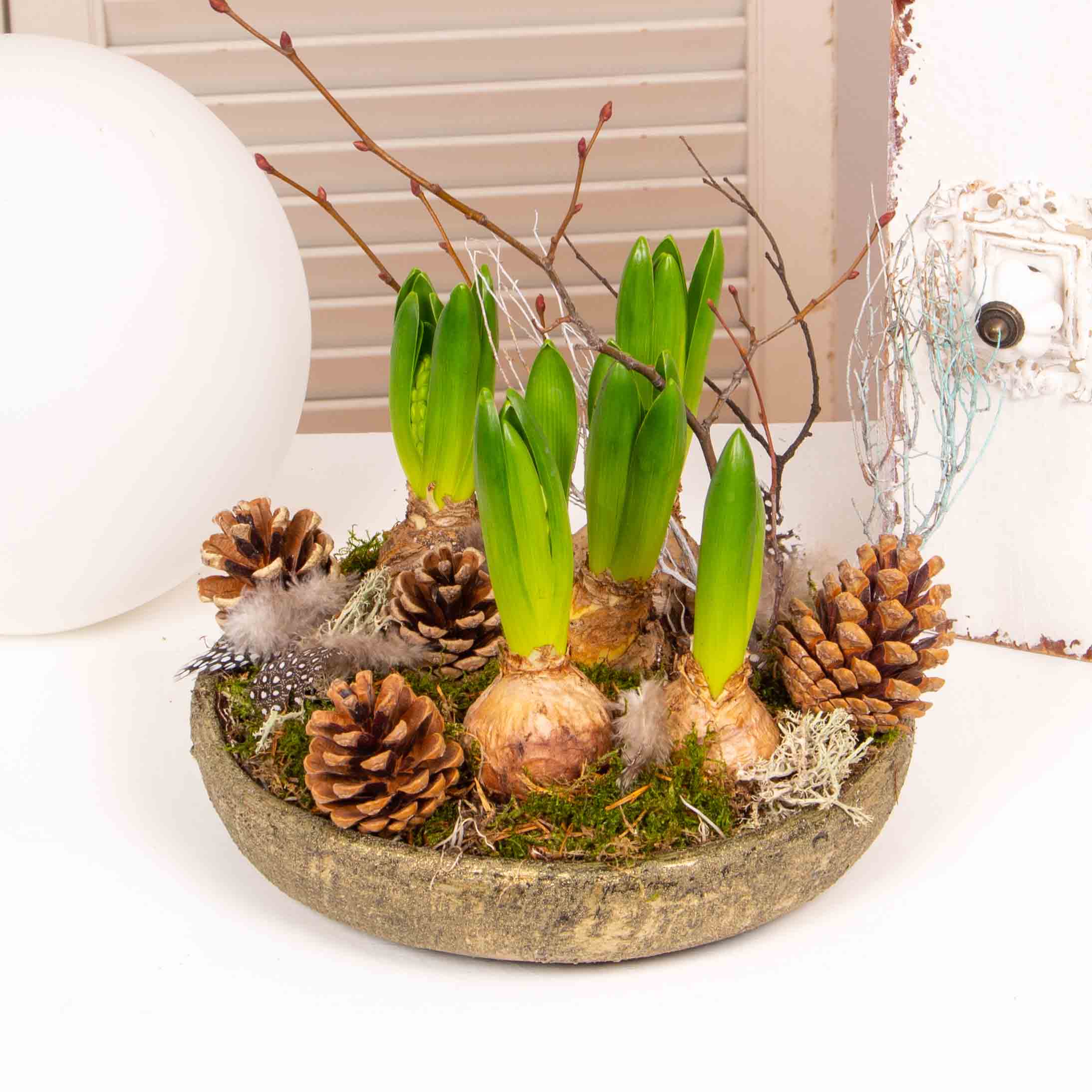 Aranajment in vas ceramic cu 5 bulbi de zambila, 4 conuri de pin uscat, pene, muschi verde, crengi.