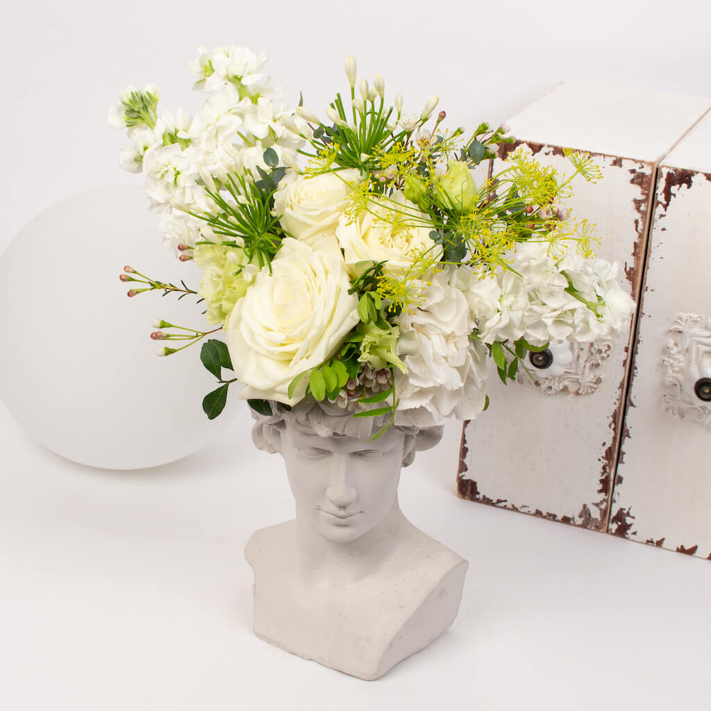 Aranjament cu vaza venus cu 3 trandafiri albi, 3 matthiola alba, lisianthus alb, verdeata si alte flori de decor.