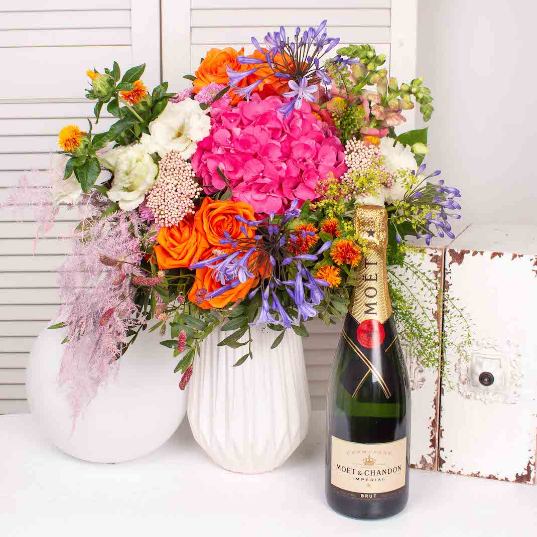Buchet cu hortensie, 2 anthirium, 5 trandafiri portocalii, 2 lisianthus alb, verdeata si alte flori si prosecco