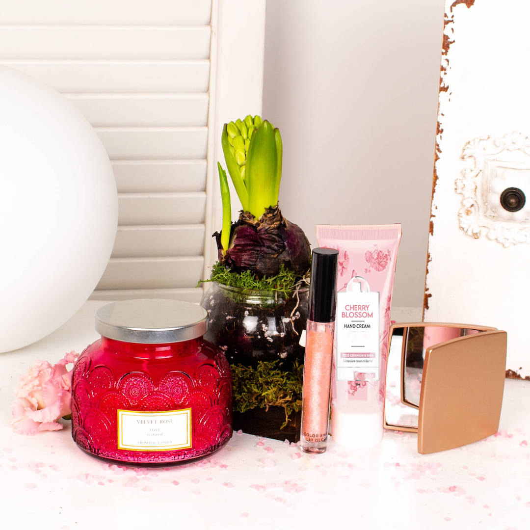 Cele mai speciale ocazii au nevoie de cadouri pe masura. Si nu puteam lasa sa treaca 1-8 Martie fara sa pregatim un cadou minunat pentru cele mai frumoase femei din viata noastra. Comanda acest cadou platou cu bulb de zambila, lumanare parfumata, crema de maini, lipgloss si oglinda poseta.