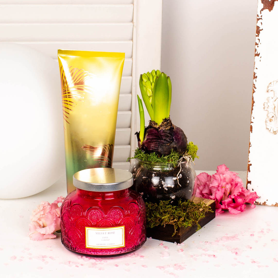 Cele mai speciale ocazii au nevoie de cadouri pe masura. Si nu puteam lasa sa treaca 1-8 Martie fara sa pregatim un cadou minunat pentru cele mai frumoase femei din viata noastra. Comanda acest cadou platou cu bulb de zambila, lotiune de corp cu cocos si lumanare parfumata.