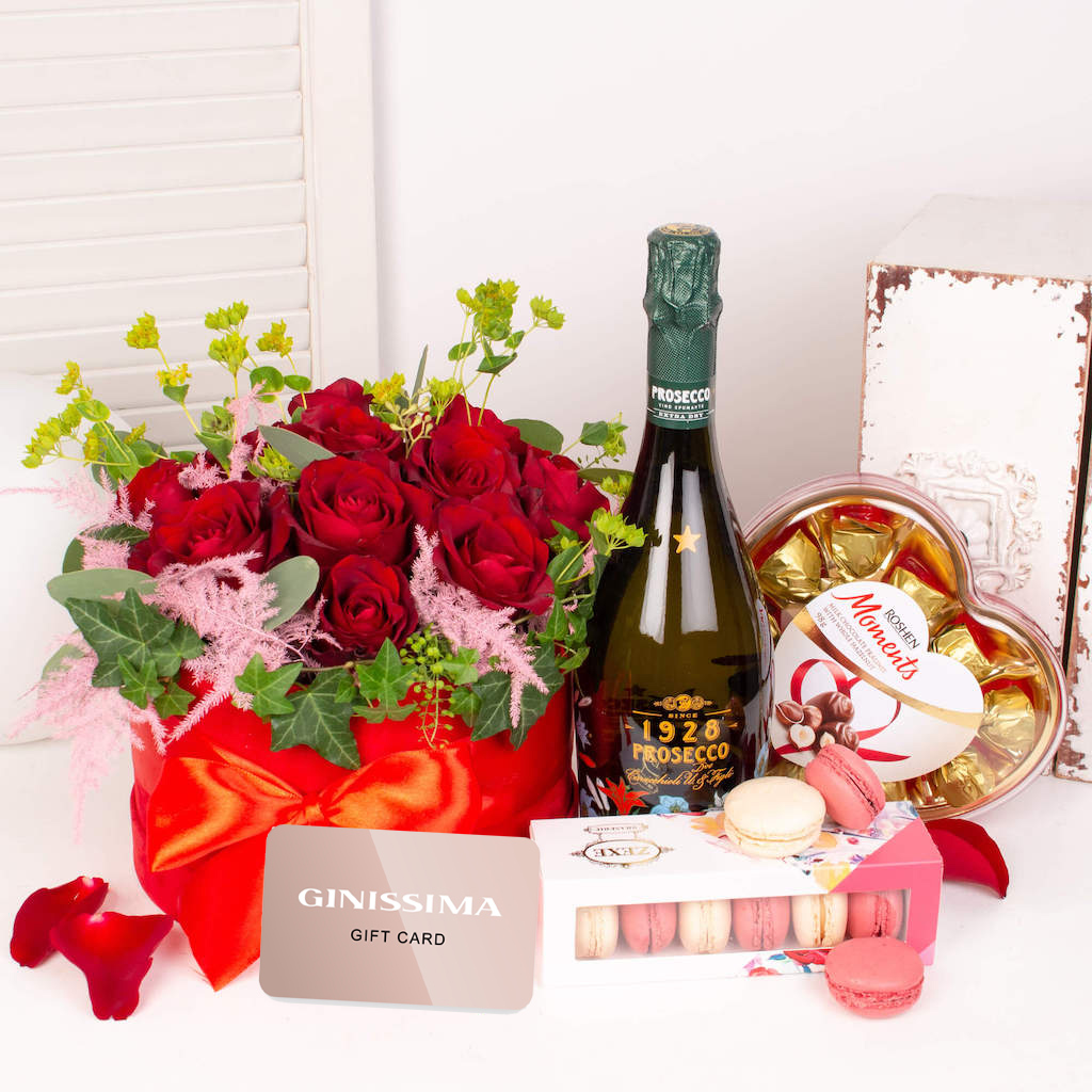 Acest cadou contine o cutie de catifea cu 11 trandafiri rosii si verdeata, un voucher pentru o pereche de pantofi Ginissima, Prosecco Extra Dry Cavicchioli 750ml, macarons de la Brasseria Zexe si praline de ciocolata cu alune de padure Roshen.