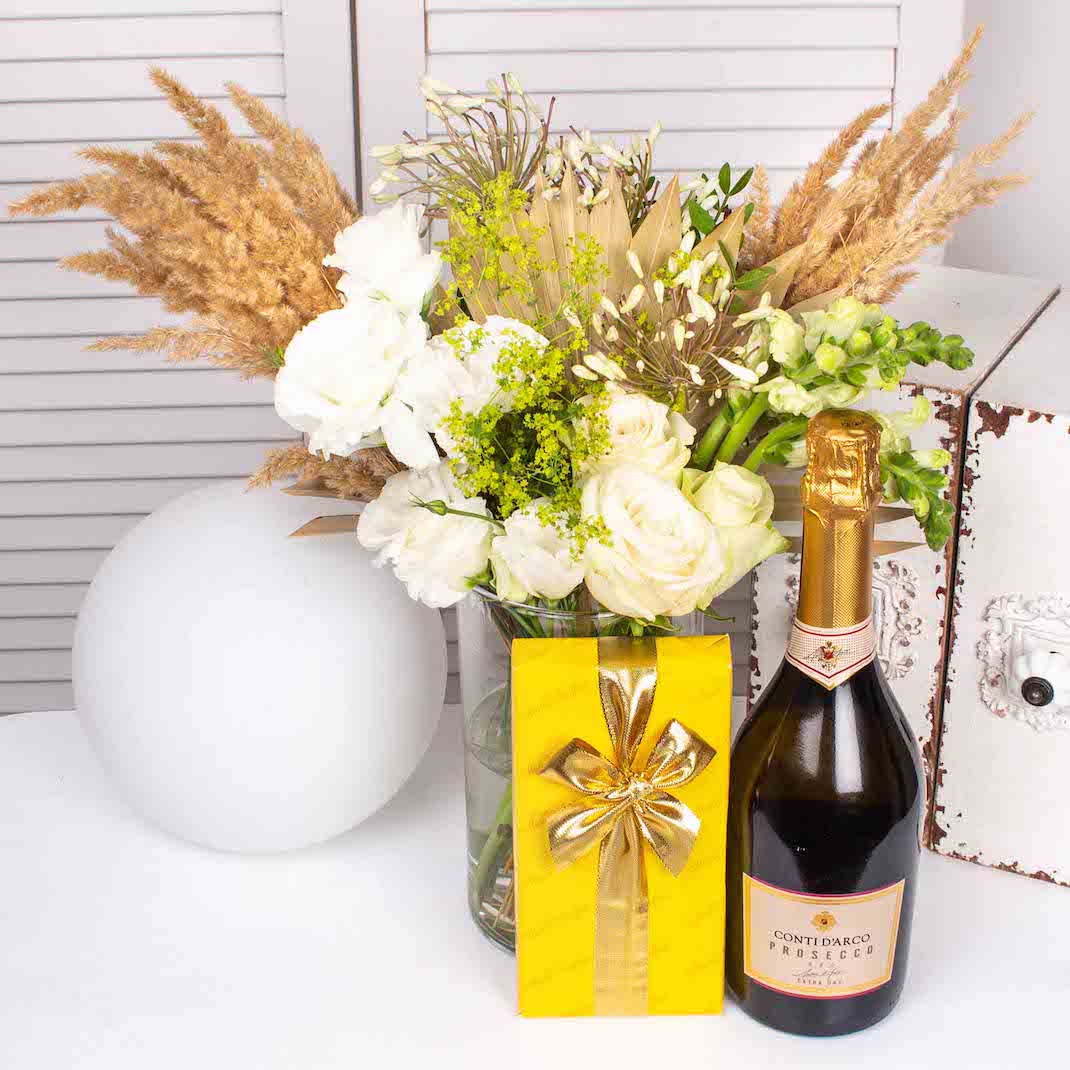 Din grija pentru mediu, ne dorim sa avem produse cat mai prietenoase cu acesta. Ce ne ofera florile e arta si terapie iar noi ar trebui sa ne asiguram ca respectam natura ce ni le-a daruit.Tocmai de aceea realizam aceste produse eco si ne-am luat angajamentul ca intreg magazinul Purple Flowers sa devina eco-friendly in cel mai scurt timp posibil. Din cauza faptului ca nu este biodegradabil si nici reciclabil, scopul nostru este de a elimina in viitor buretele floral din compozitiile produselor noastre. Acest aranjament in vaza cu trandafiri , anthirinum , lisianthus si alte flori la care am adaugat o sticla de prosecco Conti Darco si praline belgiene cu ciocolata este alegerea perfecta pentru a face o surpriza unei persoane dragi.
