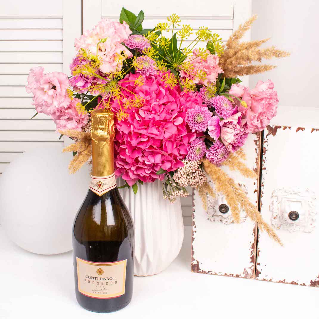 Buchet cu hortensie roz, 2 crizanteme, 2 lisianthus roz, 2 garoafe, verdeata si alte flori si prosecco