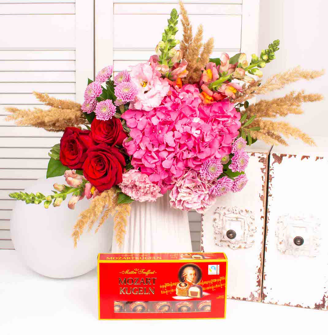 Bucheet cu hortensie roz, 3 trandafiri rosii, 2 crizanteme, 3 anthirinum portocaliu, verdeata si alte flori si praline de ciocolata cu martipan