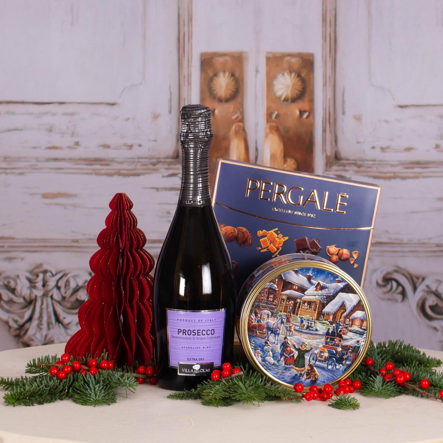 Acest produs contine: Prosecco Extra Dry DOC Villa DegliOlmi 750ml , Praline de ciocolata neagra cu patru arome Pergale 114g, Fursecuri in cutie metalica “Peisaj de iarna” 340g, Decoratiune brad de hartie