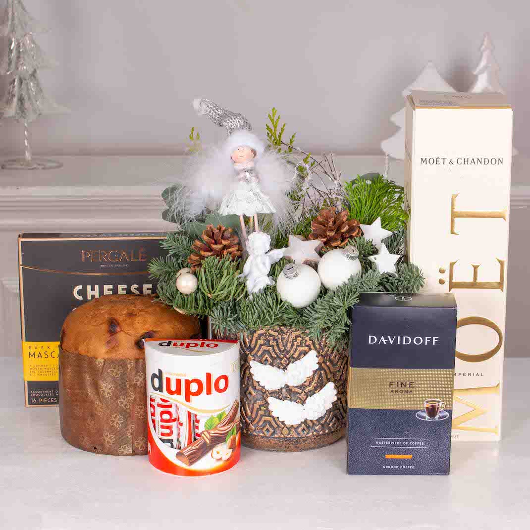 Cele mai speciale ocazii au nevoie de cadouri pe masura. Transforma o petrecere intr-o amintire frumoasa cu acest cos cadou cu Aranjament de Craciun cu fetita si ingeras, sampanie, panetone, cafea si ciocolata. Cel mai frumos moment este acela in care ne oferim cadouri, in care daruim zambete celor dragi.