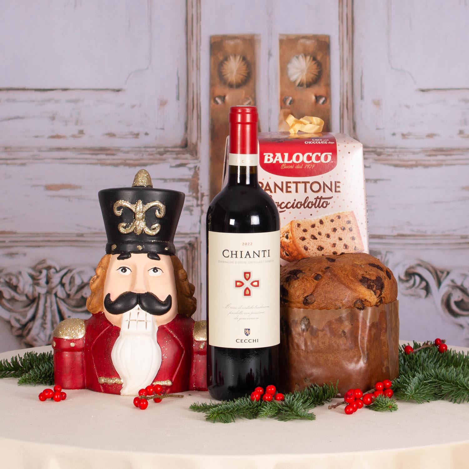 Acest produs contine: Vin rosu Chianti Cecchi DOC 750ml , Panetone Balocco cu crema de ciocolata 500g, Figurina de Craciun din ceramica