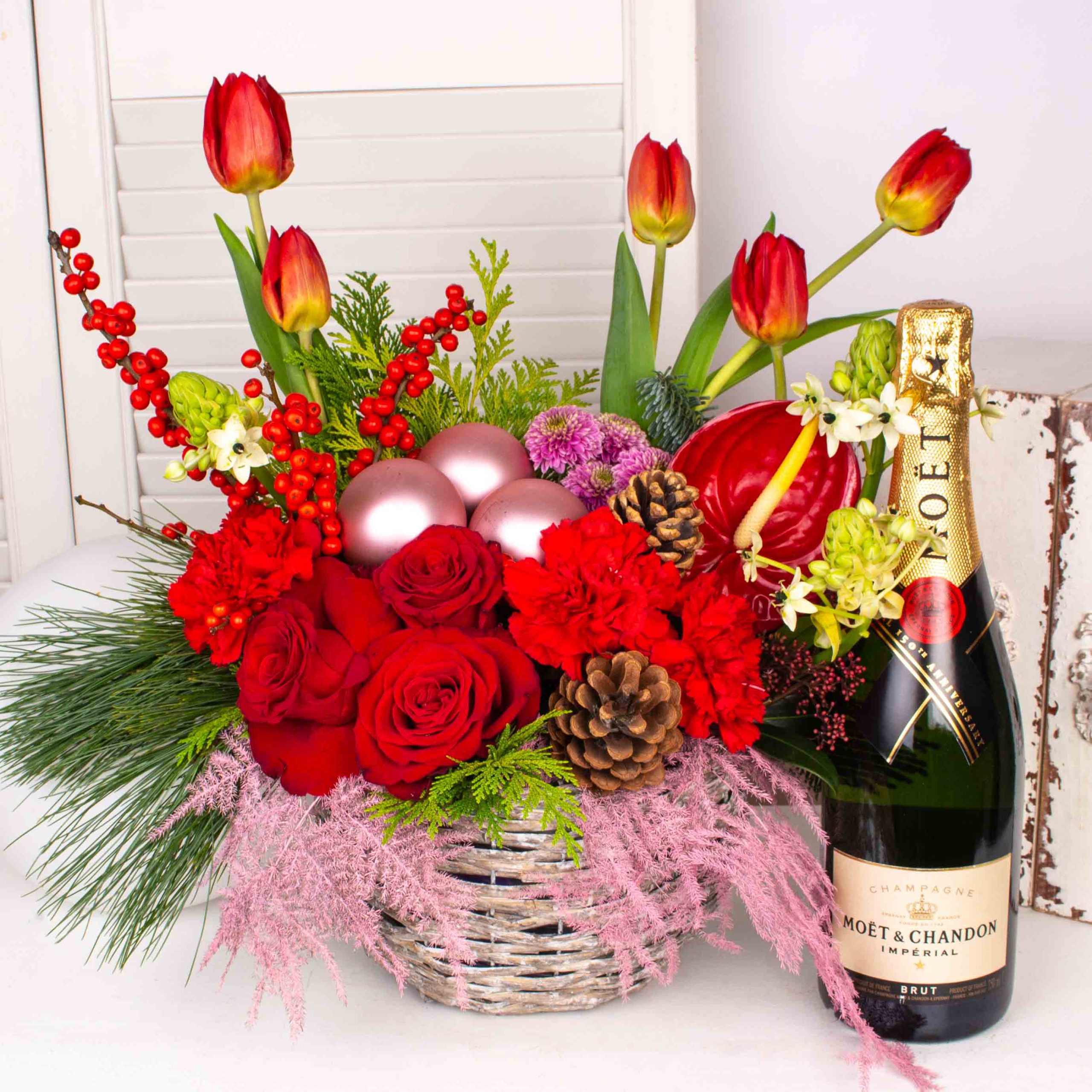 Cadou cu aranjament floral si sampanie Moet.