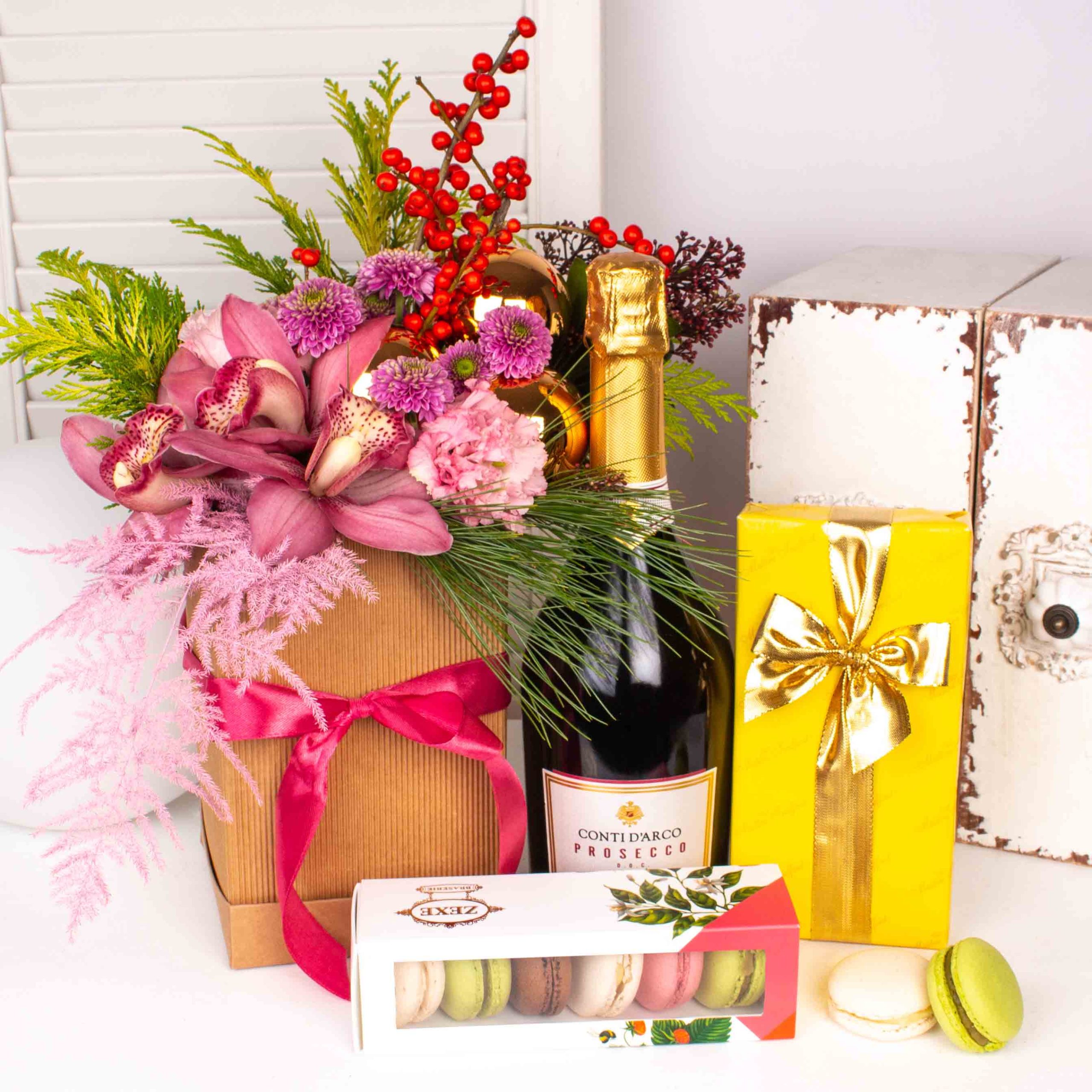 Cadou cu aranjament floral, prosecco, macarons, praline de ciocolata.