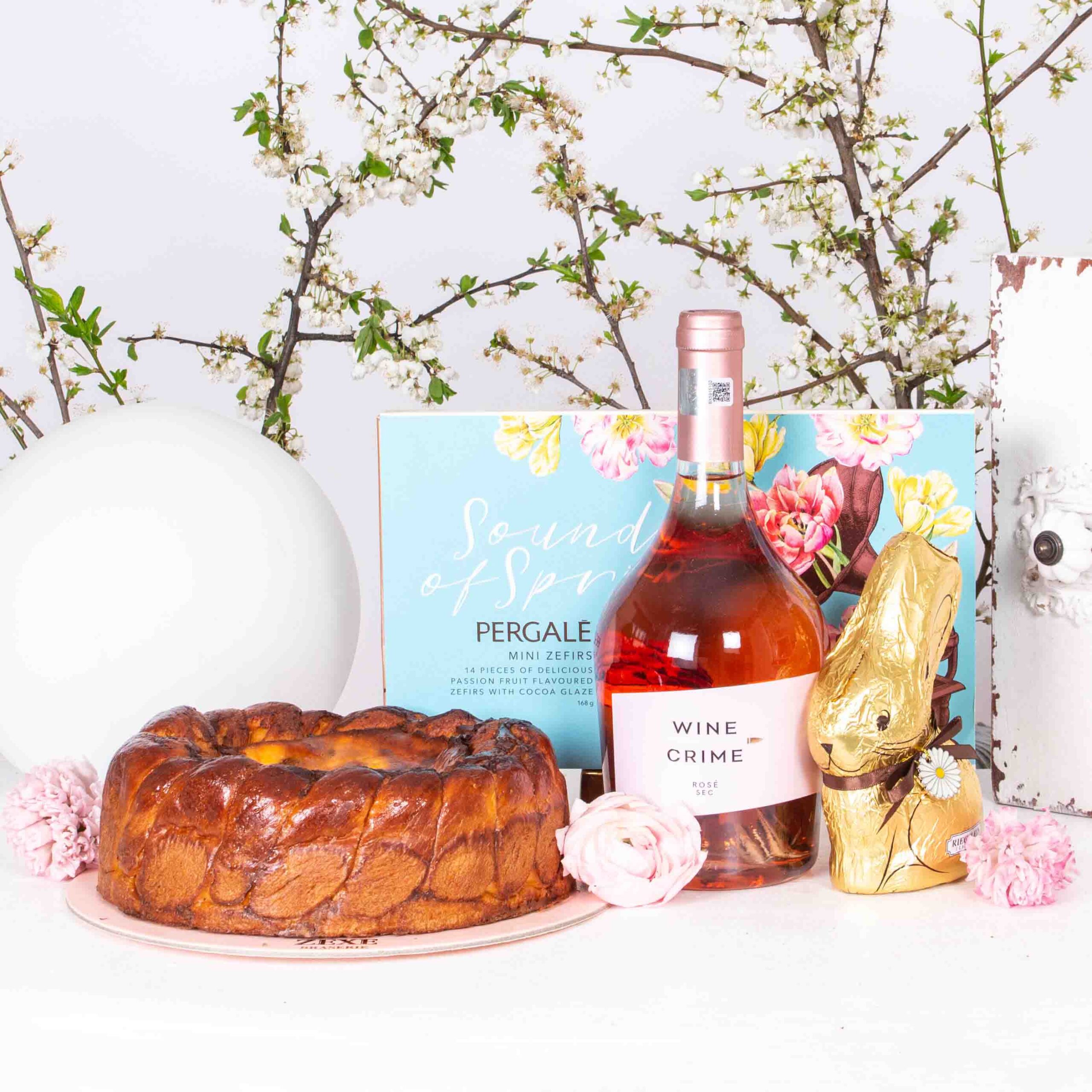 Cadou cu pasca, bomboane Pergale cu fructul pasiunii, iepure de ciocolata si vin