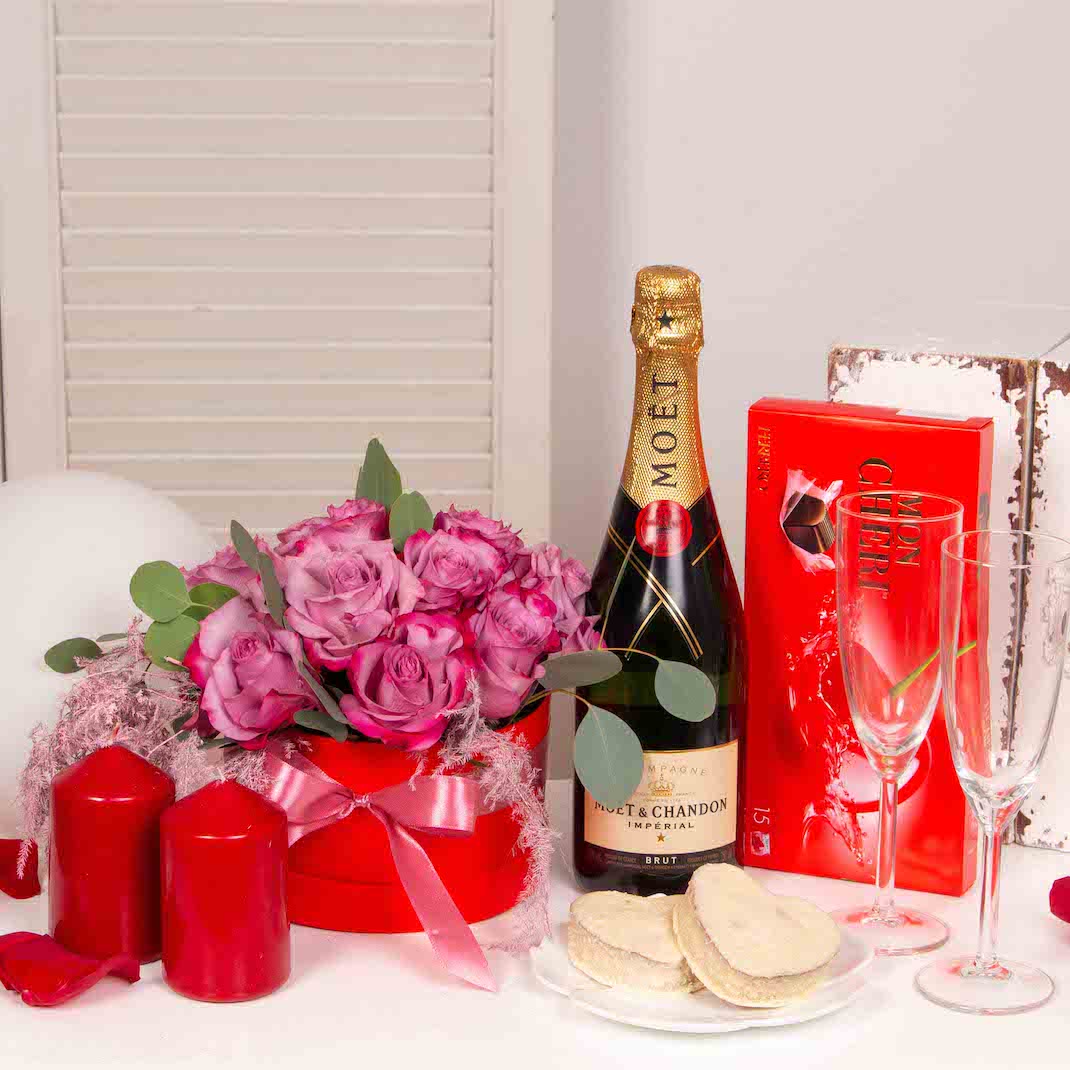 Acest cadou contine o cutie rosie cu 11 trandafiri roz, prajituri cu ciocolata alba si fulgi de cocos Adore, praline de ciocolata Mon Cheri, lumanari rosii, sampanie Moet si 2 pahare sampanie.