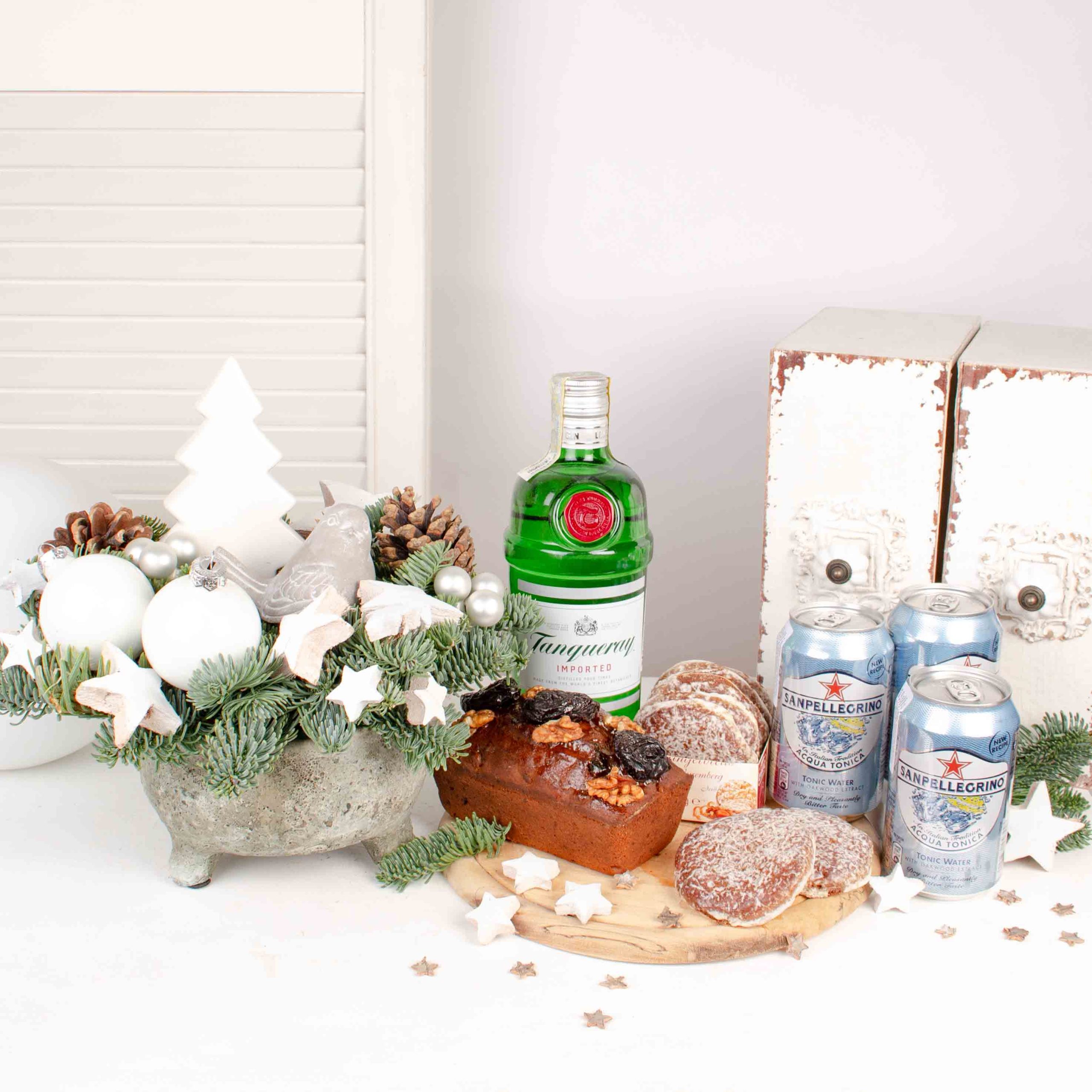 Cele mai speciale ocazii au nevoie de cadouri pe masura. Transforma o petrecere intr-o amintire frumoasa cu acest cos cadou cu aranjament cu globuri si stelute albe, chec cu ciocolata si portocale si gin Tanqueray & apa tonica San Pellegrino. Cel mai frumos moment este acela in care ne oferim cadouri, in care daruim zambete celor dragi.