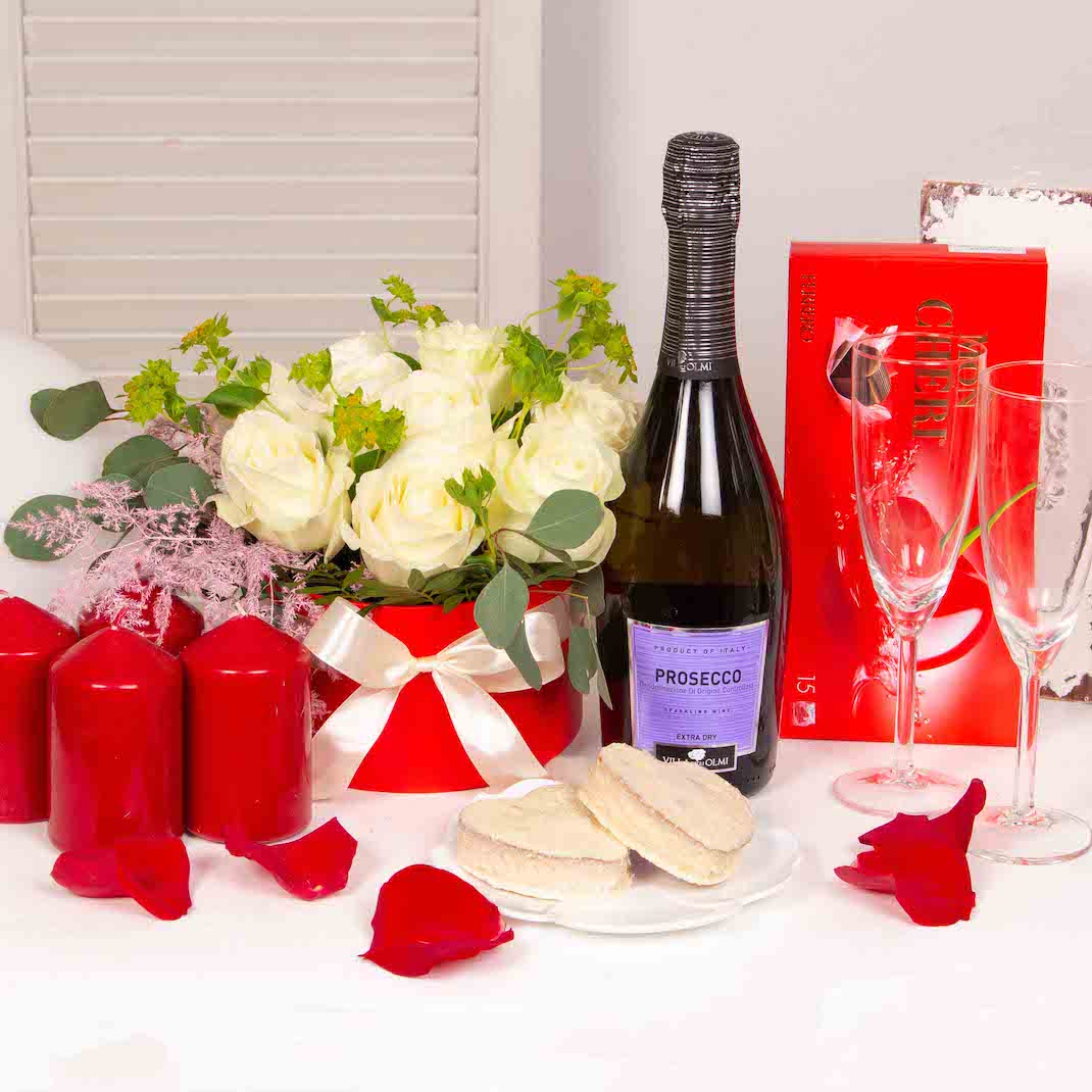 Acest cadou contine o cutie rosie cu 9 trandafiri albi, prajituri cu ciocolata alba si fulgi de cocos Adore, praline de ciocolata Ferrero Mon Cheri, lumanari rosii, Prosecco Villa Olmi si pahare sampanie.