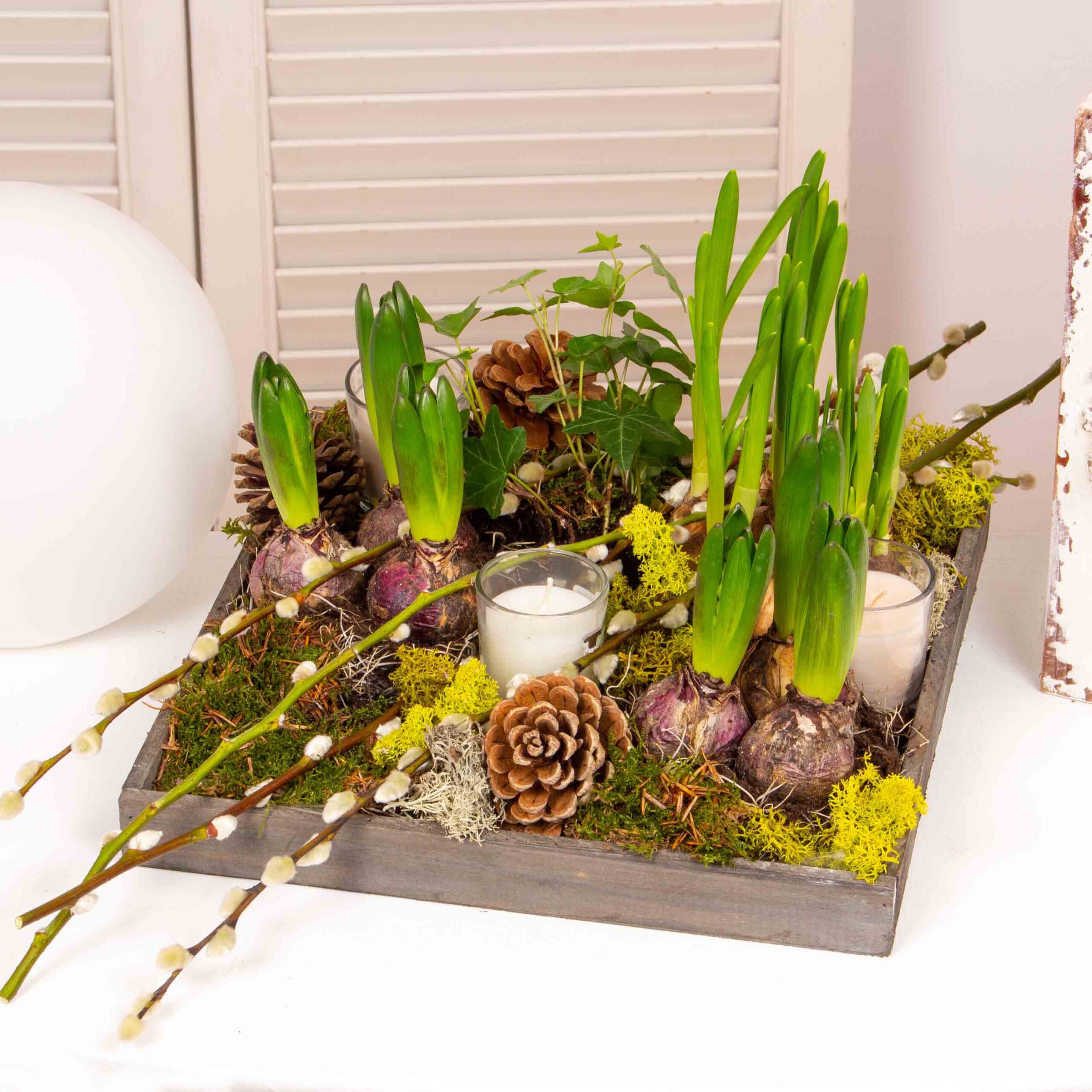Aranjament in tavita de lemn cu 6 bulbi de zambila, 5 bulbi de narcisa, iedera, muschi verde si alte elemente de decor.
