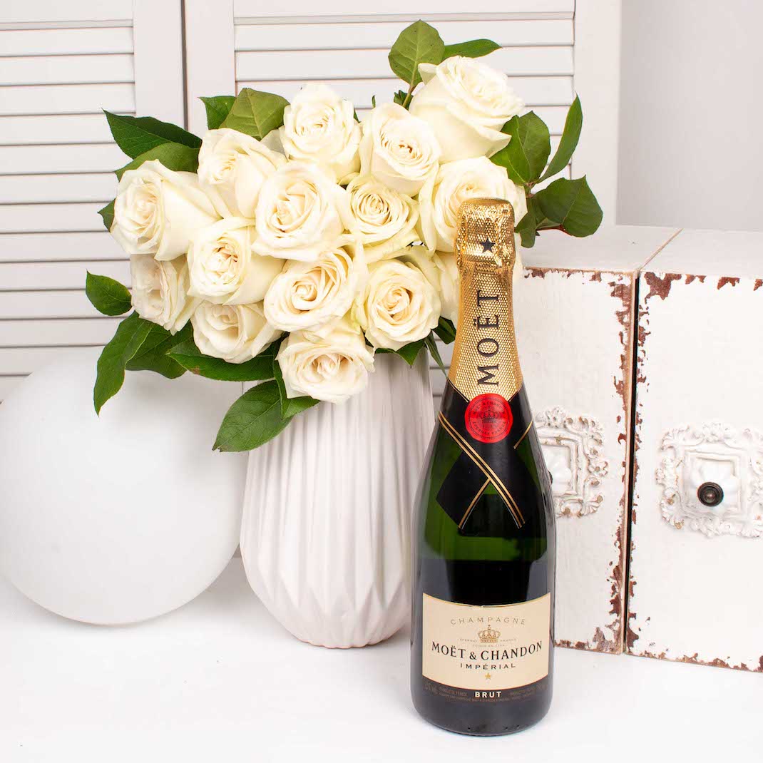 Buchet cu 19 trandafiri albi si verdeata de decor, sampanie Moet