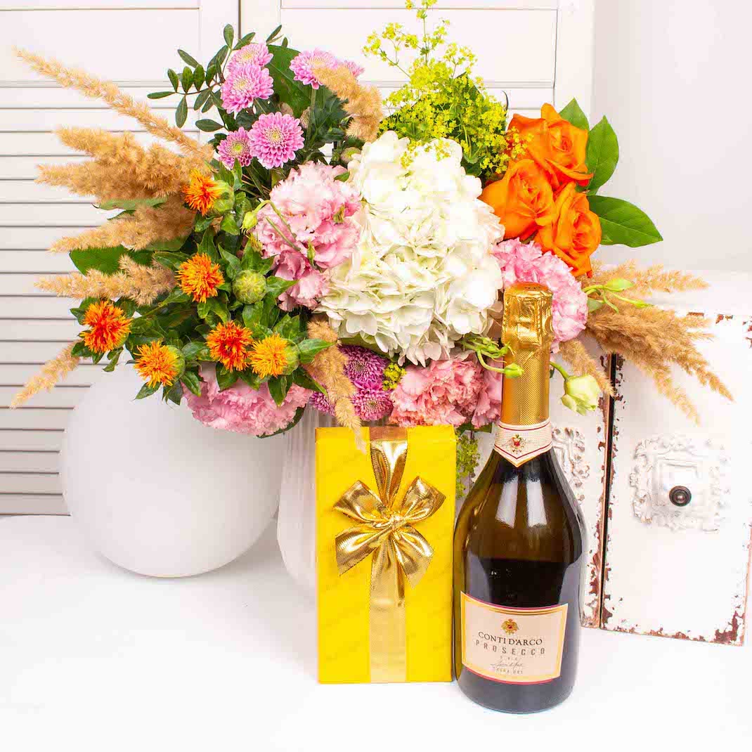 Buchet cu 3 trandafiri portocalii, 2 lisianthus roz, 2 crizanteme, verdeata si alte flori, prosecco si praline de ciocolata belgiana