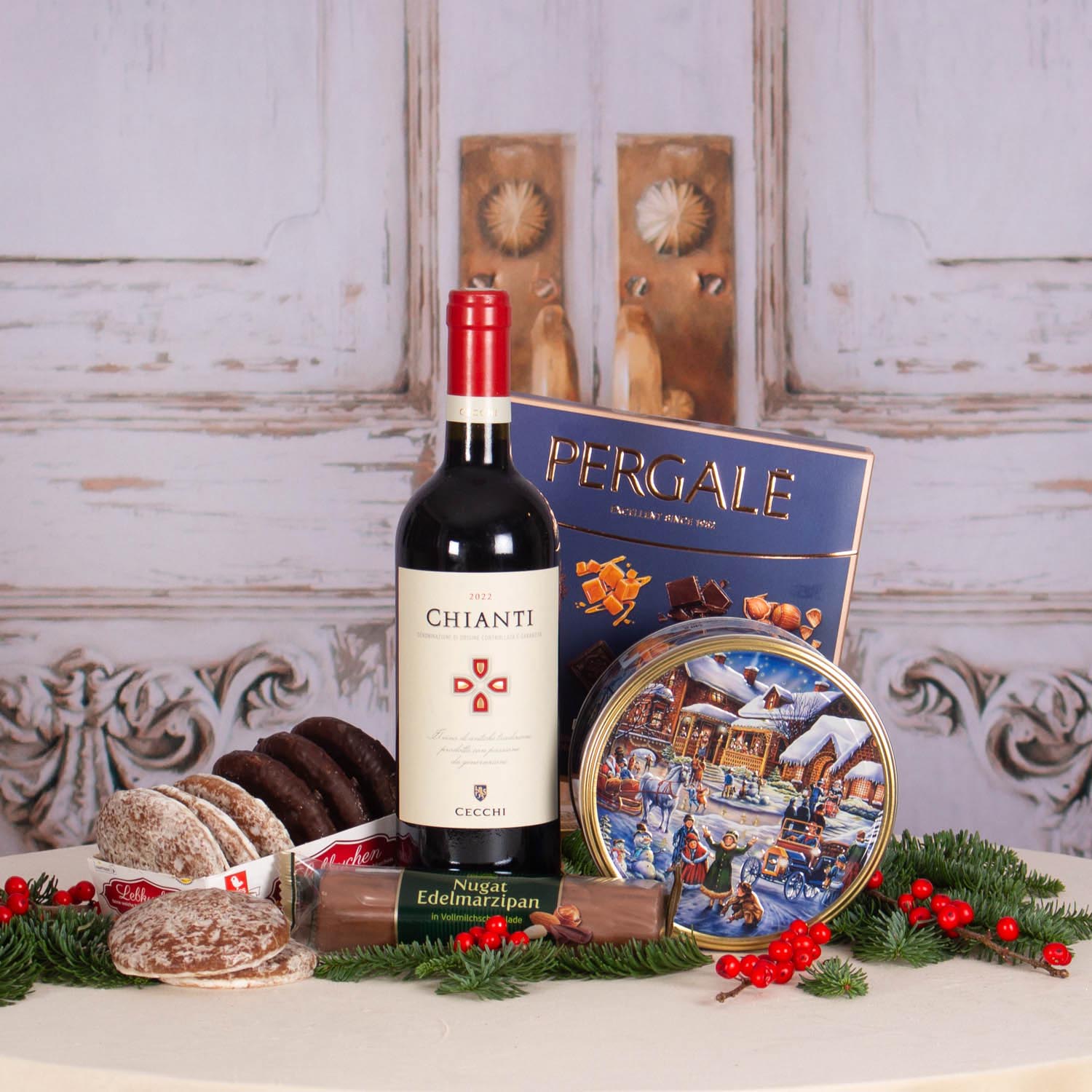 Acest produs contine: Vin rosu Chianti Checci DOC 750ml, Fursecuri in cutie metalica “Peisaj de iarna” 340g, Praline de ciocolata neagra cu patru arome Pergale 114g, Turta dulce cu ciocolata Weiss 200g, Nuga cu martipan 100g