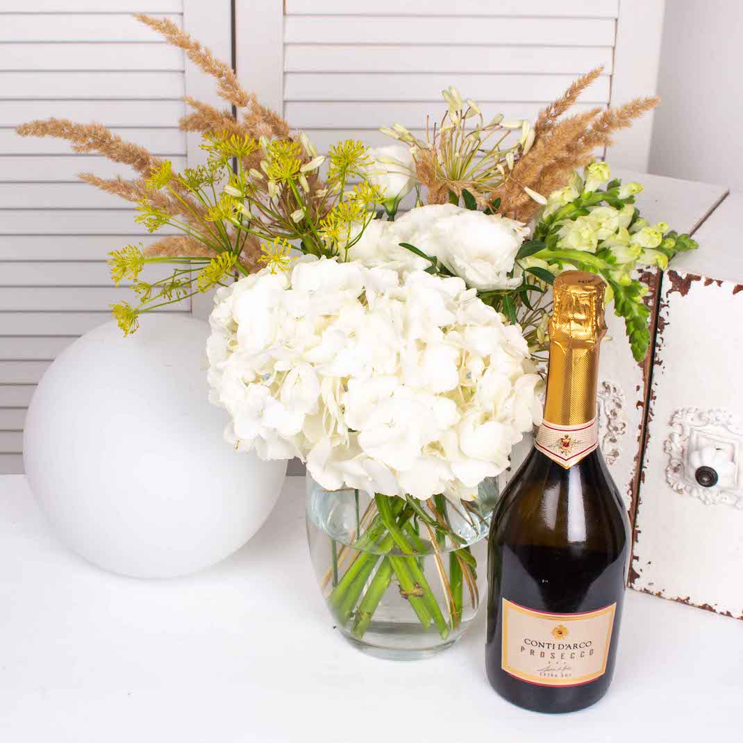 Din grija pentru mediu, ne dorim sa avem produse cat mai prietenoase cu acesta. Ce ne ofera florile e arta si terapie iar noi ar trebui sa ne asiguram ca respectam natura ce ni le-a daruit.Tocmai de aceea realizam aceste produse eco si ne-am luat angajamentul ca intreg magazinul Purple Flowers sa devina eco-friendly in cel mai scurt timp posibil. Din cauza faptului ca nu este biodegradabil si nici reciclabil, scopul nostru este de a elimina in viitor buretele floral din compozitiile produselor noastre. Acest aranjament in vaza cu anthirinum , hortensie , lisianthus si alte flori la care am adaugat o sticla de prosecco Conti Darco este alegerea perfecta pentru a face o surpriza unei persoane dragi.