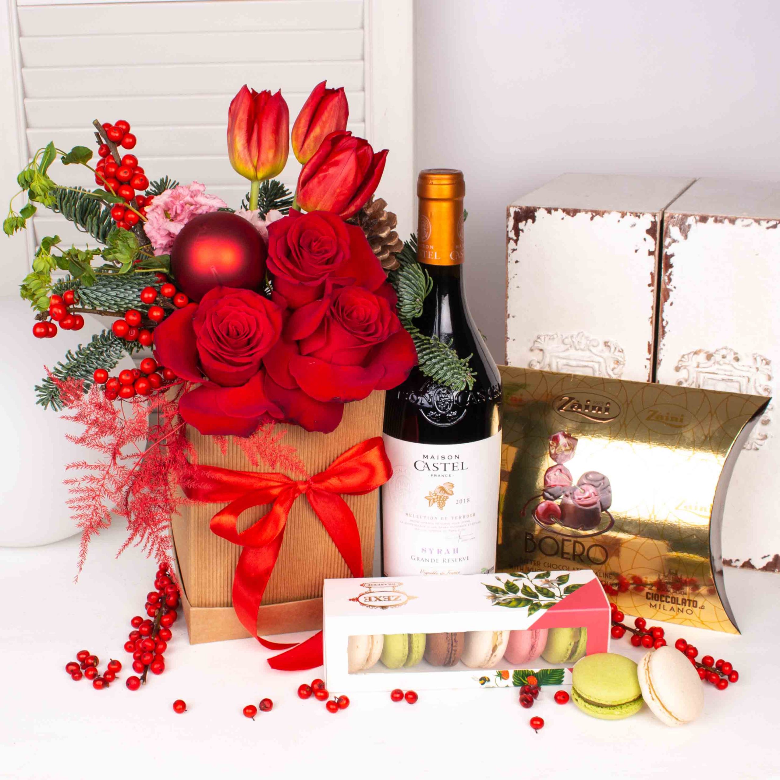 Cadou cu aranjament floral in cutie cu 3 trandafiri rosii, 3 lalele rosii, verdeata si alte flori de decor, vin rosu, macarons, praline de ciocolata.