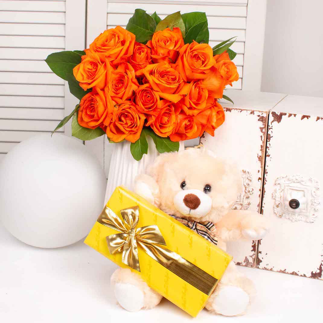 Buchet cu 15 trandafiri portocalii si verdeata de decor, praline cu ciocolata belgiana si urs mic de plus