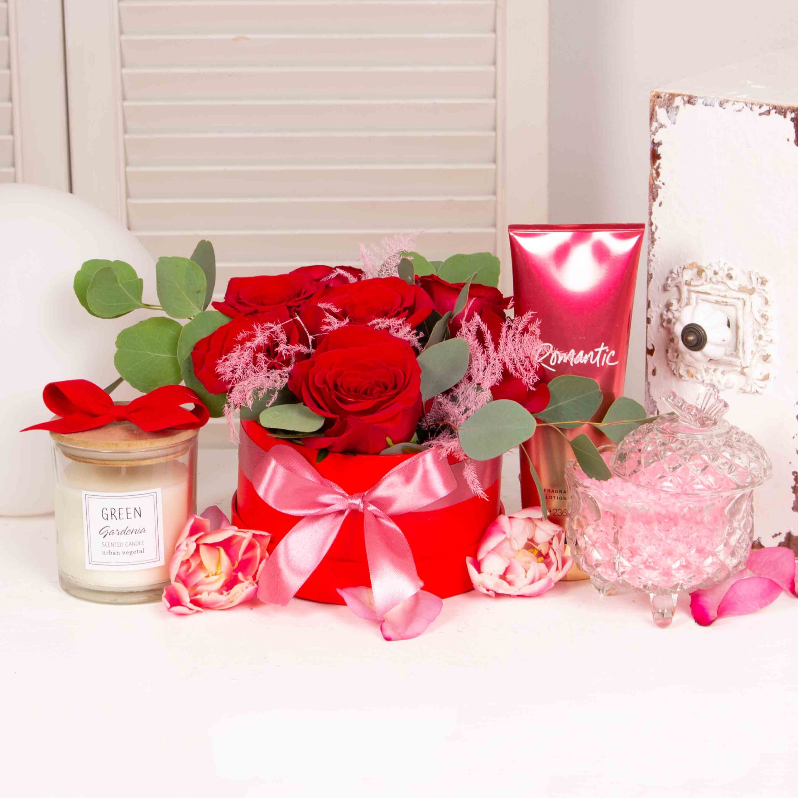 Acest cadou contine: Lotiune corp , bomba baie , bomboniera , cutie cu 7 trandafiri rosii, lumanare parfumata