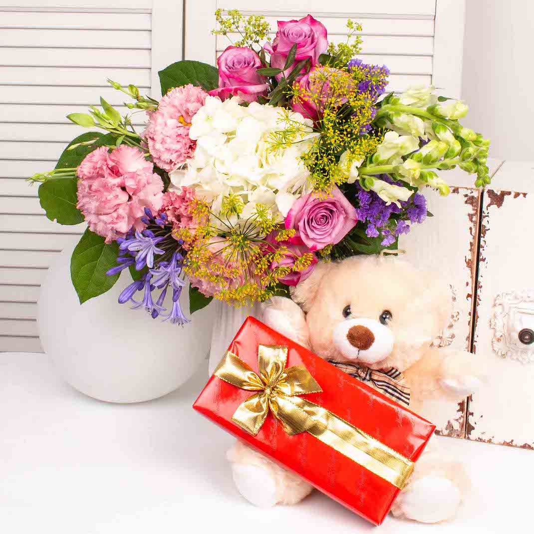 Buchet cu hortensie alba, 5 trandafiri roz, 2 anthirinum alb, lisianthus roz, verdeata si alte flori, ursulet mic de plus si praline de ciocolata belgiana