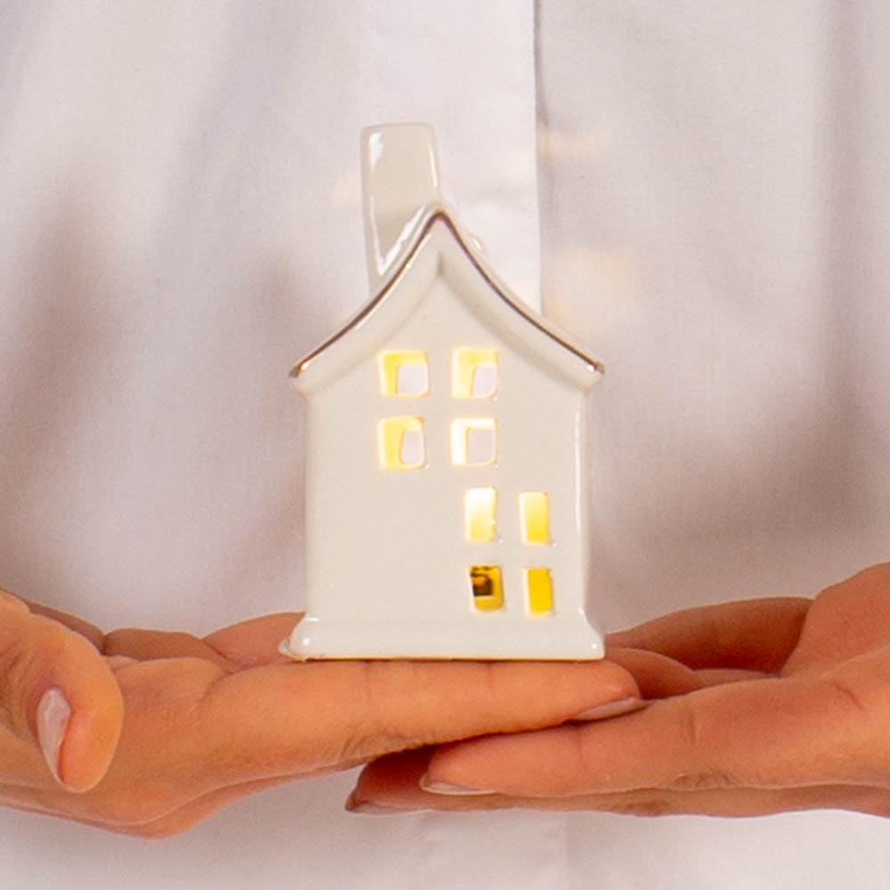 Contine : Casa cu LED din portelan 5,3 x 5,1 x 9 cm alba