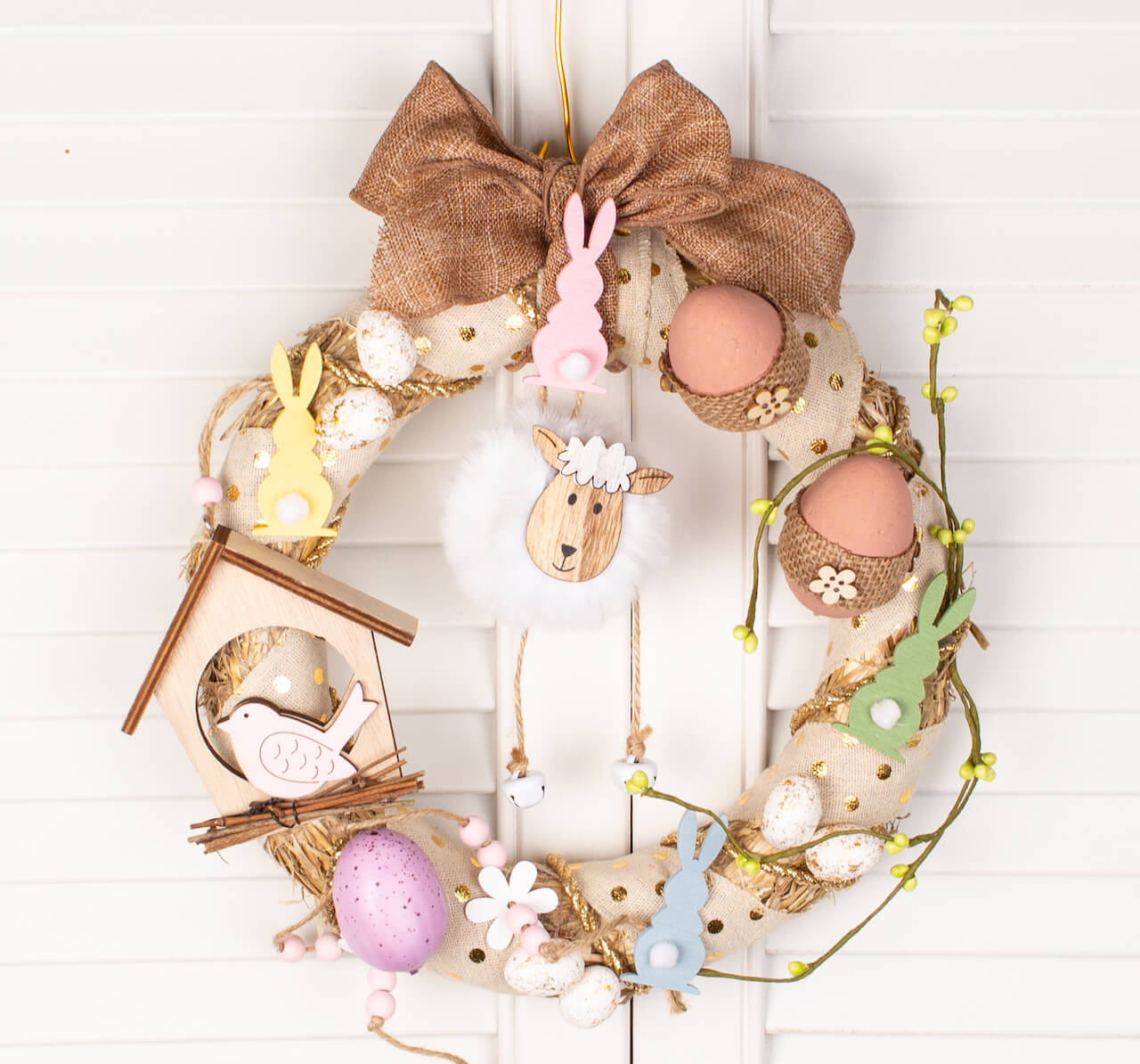 Coronita de paie diam 25 cm, 2 funde, figurina medie oita, figurina medie casuta, 3 oua mari de plastic, 6 oua mici de plastic si alte elemente de decor.