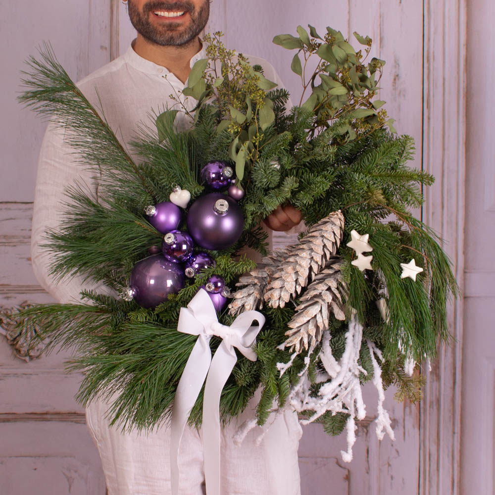 Craciunul ne aduce aminte de copilarie. Cel mai frumos moment este acela in care ne oferim cadouri, acela in care daruim zambete celor dragi. Un aranjament de Craciun este cadoul perfect pentru a-i surprinde pe cei apropiati noua. Inspirati de frumusetea sarbatorilor de iarna am creat aceasta coronita cu globuri mov si alte decoratiuni de Craciun.