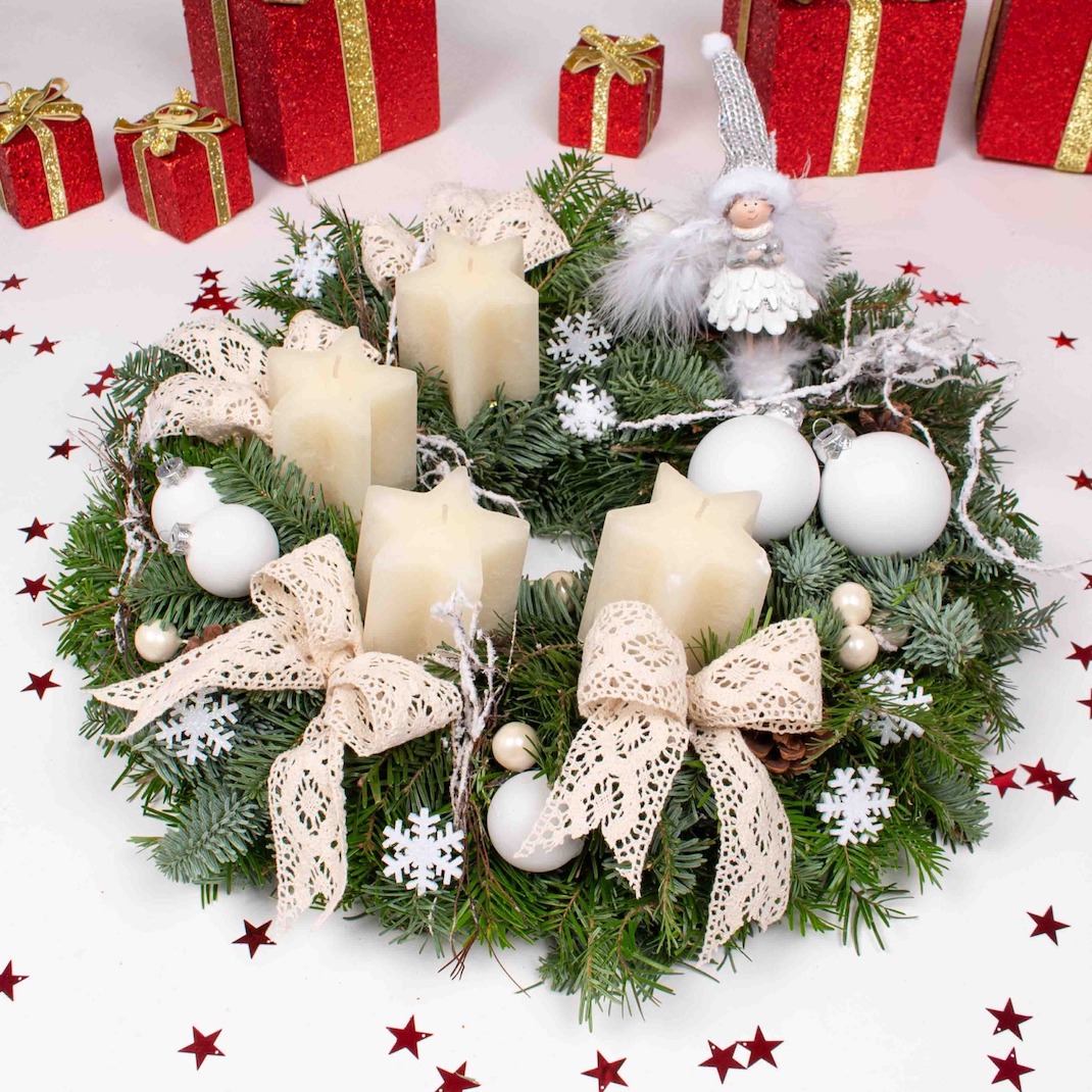 Craciunul ne aduce aminte de copilarie. Cel mai frumos moment este acela in care ne oferim cadouri, acela in care daruim zambete celor dragi. Un aranjament de Craciun cu brad , fulgi de pasla si lumanari este cadoul perfect pentru a-i surprinde pe cei apropiati noua. Inspirati de frumusetea sarbatorilor de iarna am creat aceasta coronita cu figurine si globuri.