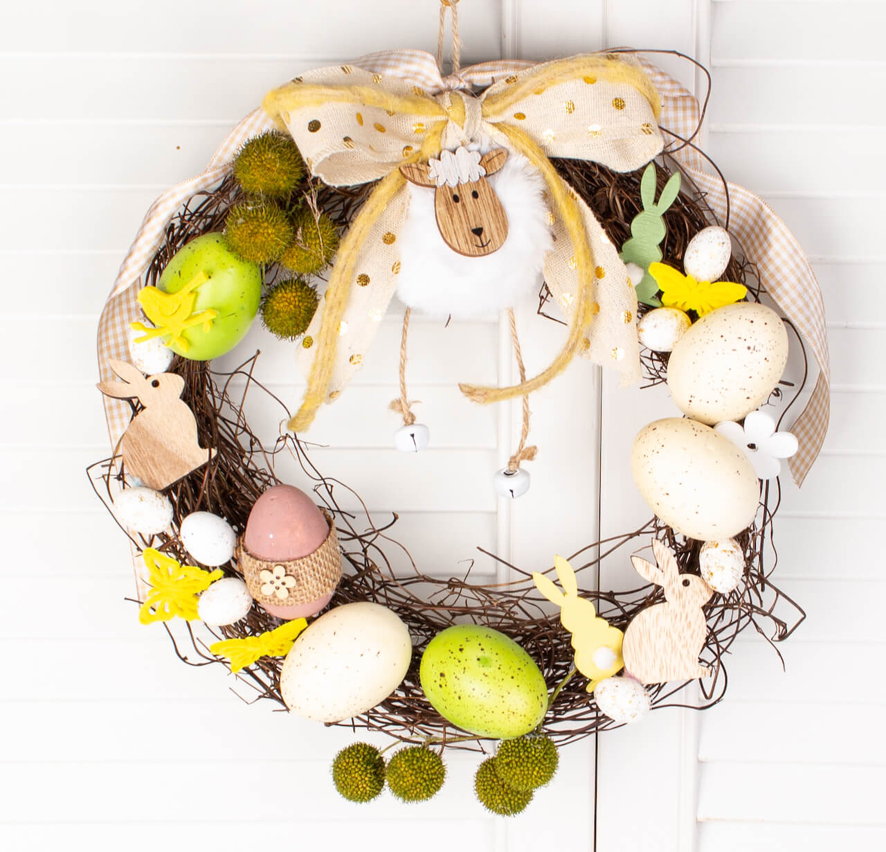 Coronita din nuiele cu funda, figurina medie oita, 6 oua mari de plastic, 8 oua mici de plastic si alte elemente de decor.