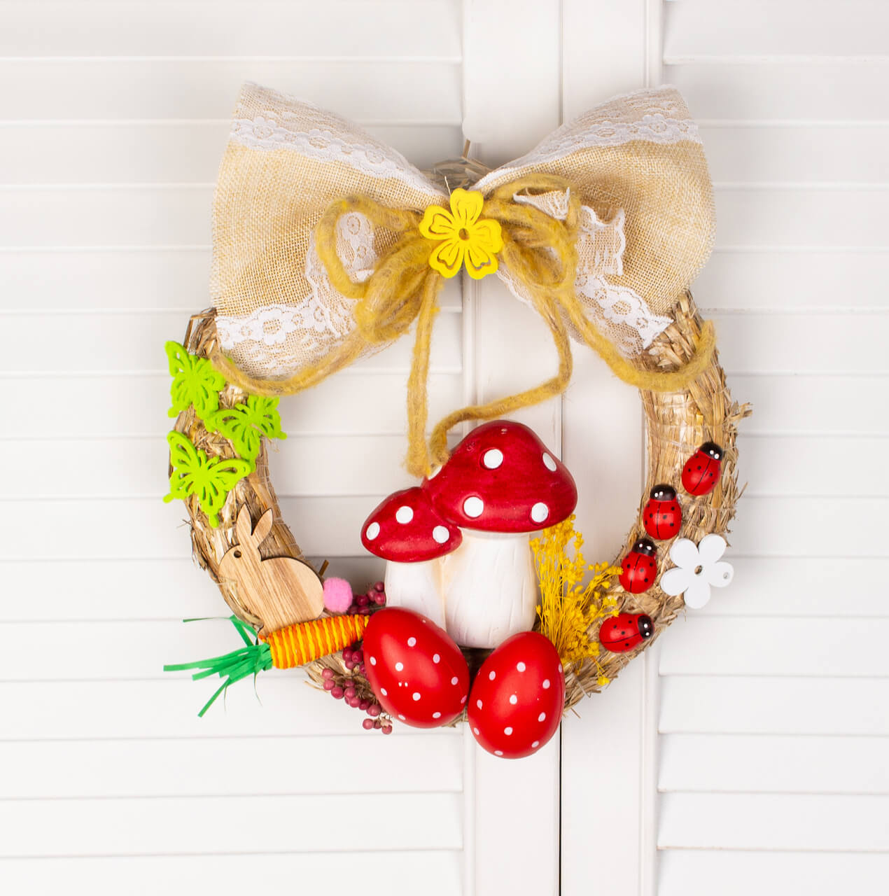 Coronita de paie cu diam 25 cm, funda, figurina medie ciupercute, 2 oua mari de plastic si alte elemente de decor.