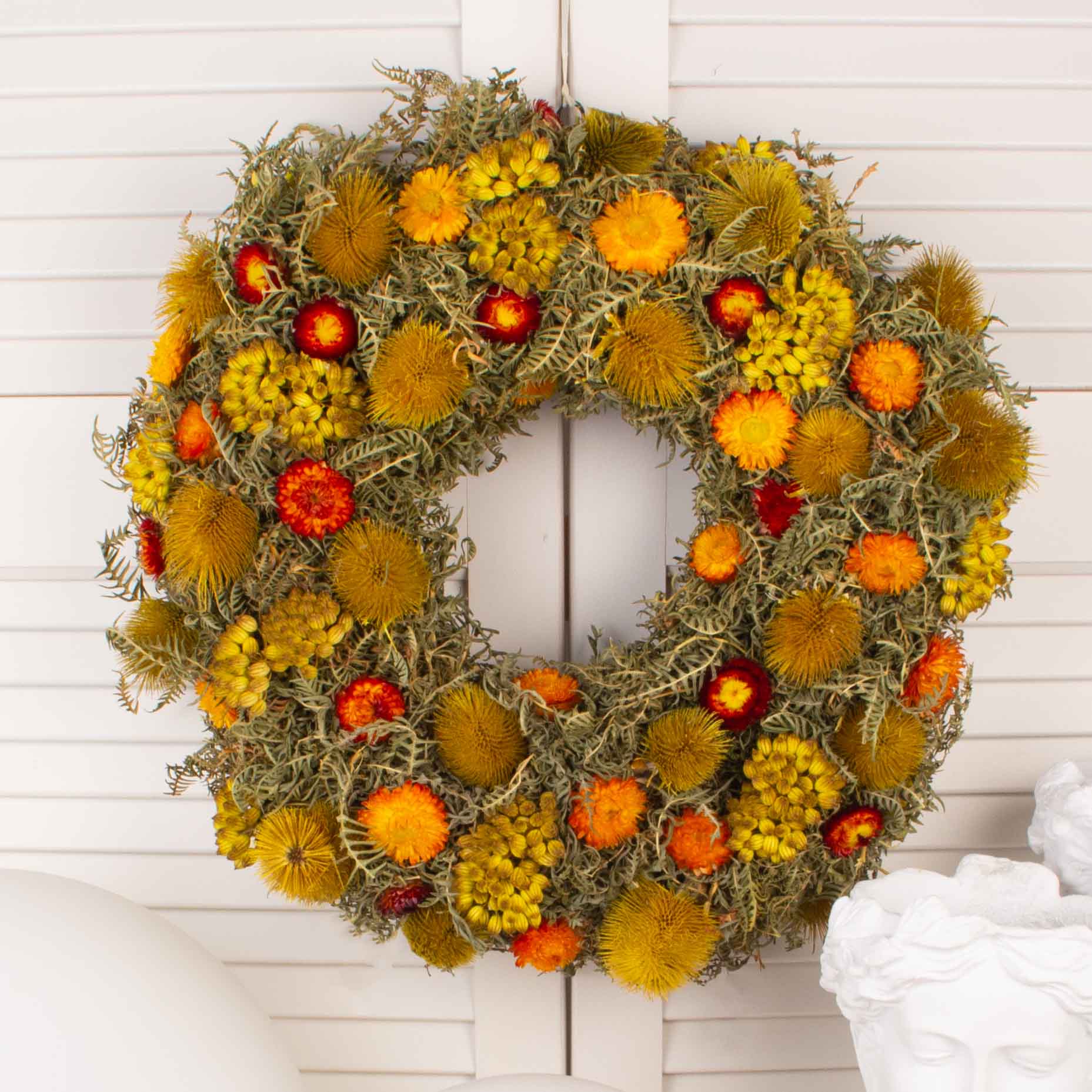Florile daruite din suflet transmit emotii frumoase celor dragi. Mai ales aceasta coronita de toamna cu flori uscate. Combinatiile de flori roz, galbene, portocalii si rosii sunt cele mai spectaculoase toamna, iar aceste coronite sunt cel mai frumos cadou de sezon. Si pentru ca stim ca sunt momente pe care ati vrea sa le pastrati mereu in amintire, am realizat aceste coronite cu flori uscate de toamna pentru a sarbatori evenimentele fericite din viata voastra. Potrivit persoanelor mereu vesele si pline de viata, un astfel de cadou le va insenina cu siguranta ziua. Adauga un mesaj personalizat si transforma o zi banala intr-o amintire frumoasa!