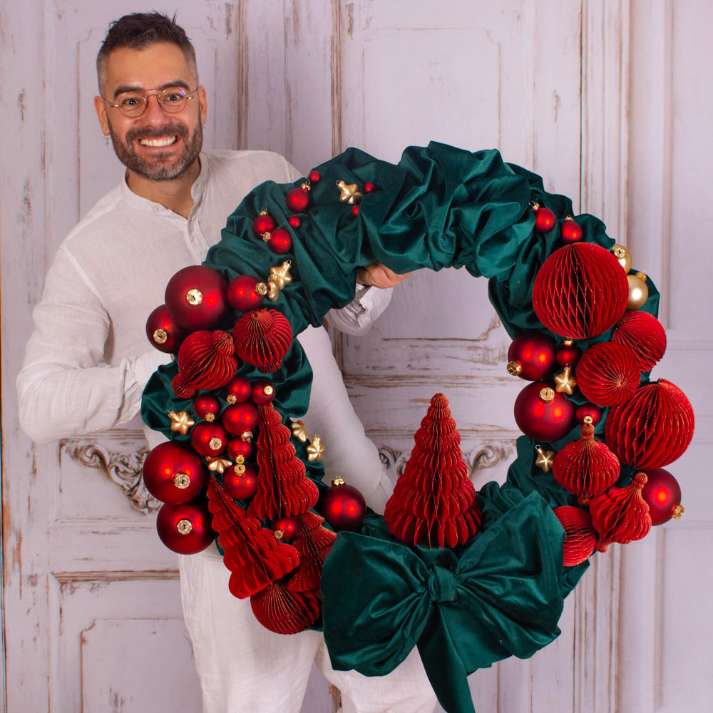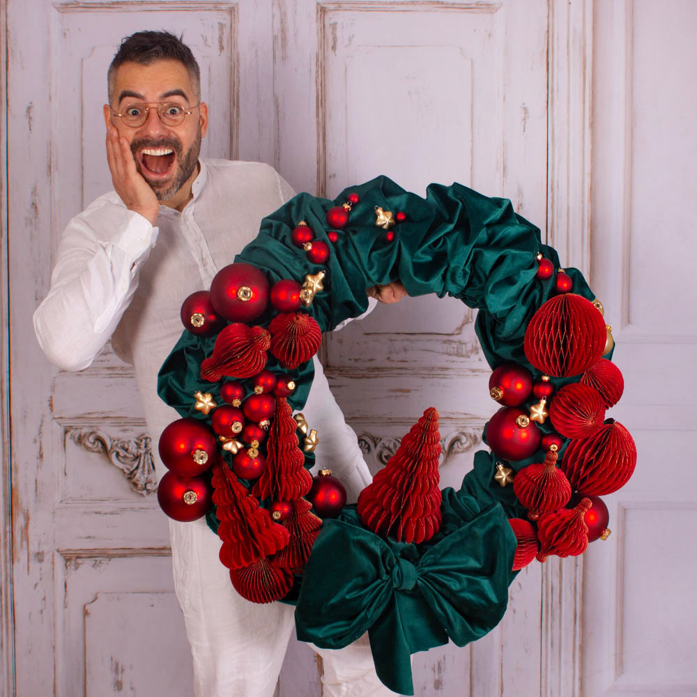 Craciunul ne aduce aminte de copilarie. Cel mai frumos moment este acela in care ne oferim cadouri, acela in care daruim zambete celor dragi. Un aranjament de Craciun este cadoul perfect pentru a-i surprinde pe cei apropiati noua. Inspirati de frumusetea sarbatorilor de iarna am creat aceasta coronita uriasa de catifea cu globuri rosii de sticla si alte decoratiuni de Craciun.