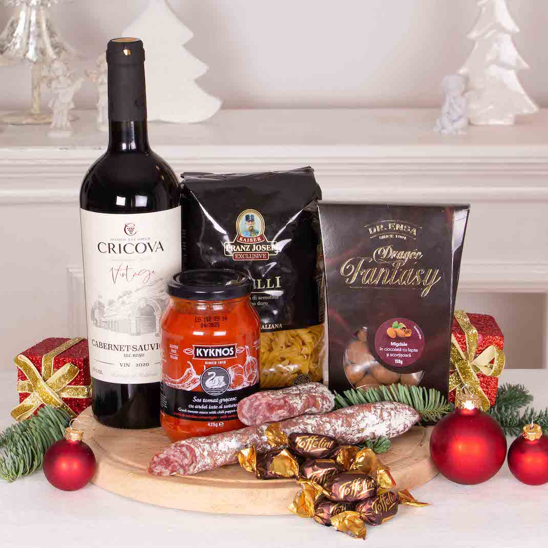 Cele mai speciale ocazii au nevoie de cadouri pe masura. Transforma o aniversare intr-o amintire frumoasa cu acest Cos cu Specialitati Gourmet si Vin Rosu . Cel mai frumos moment este acela in care ne oferim cadouri, in care daruim zambete celor dragi. Un cos cadou gourmet sau un cos cadou corporate este un fel simplu si frumos de a ne arata recunostinta, sau de a felicita pe cineva. Am ales produse de calitate, astfel incat apropiatii nostri, colegii sau partenerii de afaceri sa aiba parte de o surpriza frumoasa. Cozonac artizanal cu cacao si nuca sau mai bine, Cozonacul cu nuca insiropat cu vinars de la Braseria Zexe (bun de te lingi pe degete, la propriu!), Panettone Gran Ducale cu stafide , Chec artizanal cu ciocolata si portocale tot de la Braseria Zexe, paste delicioase si sosuri bine alese, Parmigiano Reggiano , turta dulce, praline de ciocolata, fursecuri apetisante cu unt si bineinteles, nu puteam sa nu stropim totul cu vinuri rafinate (Le Versant Cabernet Sauvignon, Wine Crime Rose, Cabernet Sauvignon Cricova Vintage Collection, Chardonnay Cricova Vintage Collection) dar si cu Prosecco si sampanie Moet. Adauga un mesaj personalizat si noi plecam de indata sa facem ceea ce stim noi mai bine, adica sa livram emotii.
